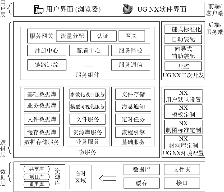 系统总体架构如图5所示。数据层由数据库、缓存和文件构成,封装为资源库和临时区域。逻辑层由微服务、NX二次开发程序、NX环境配置包组成。微服务包括服务组件、服务和服务实例。服务组件是支撑微服务架构运行的基础设置,包括服务网关、注册中心、配置中心、服务监控、链路追踪、服务通信等。服务是实现系统业务的功能单元。服务实例是服务的执行单元。根据系统的业务需求划分服务,如表2所示。