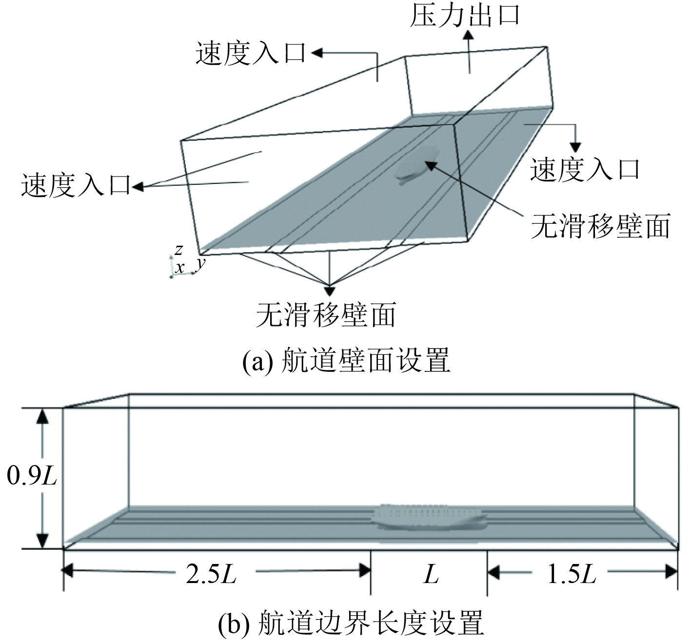 图2为DTC在铜鼓航道航行计算模型示意图,其中入口边界、航道两侧、顶部为速度入口,出口边界为压力出口,船表面和航道底部及两侧斜壁为壁面。根据铜鼓航道目前的通航制度:3万吨级及以上船舶通过铜鼓航道实行单向通行[16],因此,计算域中,将船放置于航道水域中间。本次采用平波速度来模拟水流的速度和方向,入口边界距船中横剖面1.5