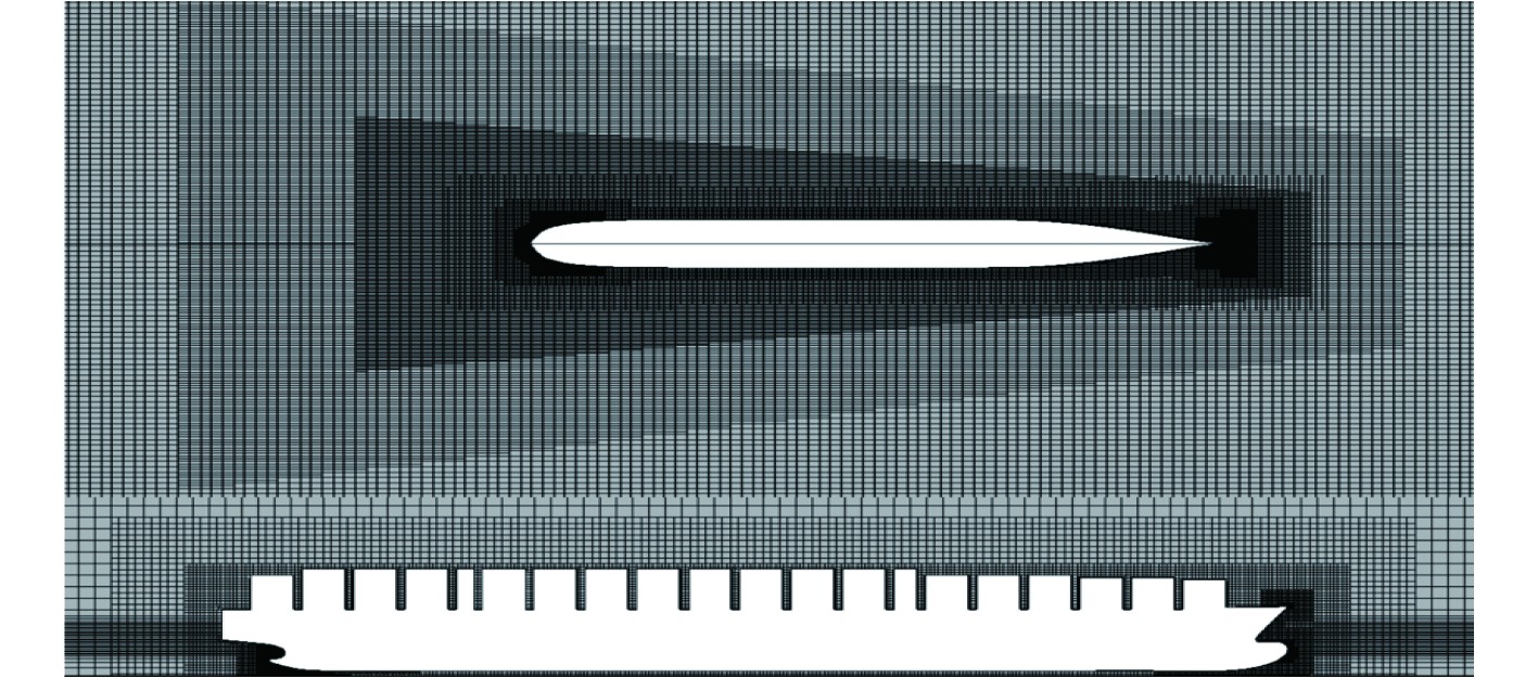 数值模拟的精度和收敛性高度依赖于网格质量。本研究采用STAR-CCM+中的切割体网格生成器,构建了非结构化六面体网格体系对计算域进行离散化处理。以h/T=1.2工况(见图3)为例,展示了船体纵剖面及自由液面区域的网格分布,其中对船首、船尾、底部边界层和自由液面进行网格加密。为提高计算效率与精度,增加多个控制体动态调节网格过渡区的密度梯度,使网格过渡更加合理,以此确保船舶湿表面和船首、尾波浪区域的流场特征(如边界层分离、自由面波动)能被精确捕捉。