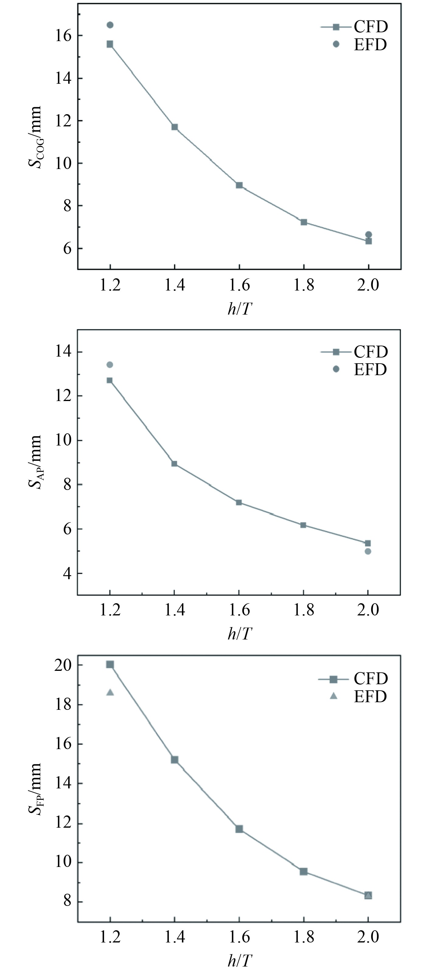 为了对本文使用的CFD方法所计算出的结果进行可行性评估,本文对DTC箱体建模后满载情况下开阔水域的h/T为1.2、2.0两种工况的结果与弗兰德斯水力学研究所(FHR)[19] 的物模实验结果进行对比验证。如图4所示,数值模拟结果与物模实验数据吻合良好,不仅验证了本文数值模拟计算方法的可行性,也验证了箱体建模后的DTC船模可用性。当水深吃水比h/T=1.2时,重心下沉量SCOG=15.60 mm,与FHR物理模型实验结果的偏差为5.45%;在h/T=2.0工况下,重心下沉量SCOG=6.32 mm,与实验结果的误差为1.86%,SAP=5.4 mm,与FHR的物模实验结果误差仅为5.59%,SFP=8.336 mm,与FHR的物模实验结果误差仅为0.7%,这2种工况下实验误差均小于10%,在可接受的误差范围内。
