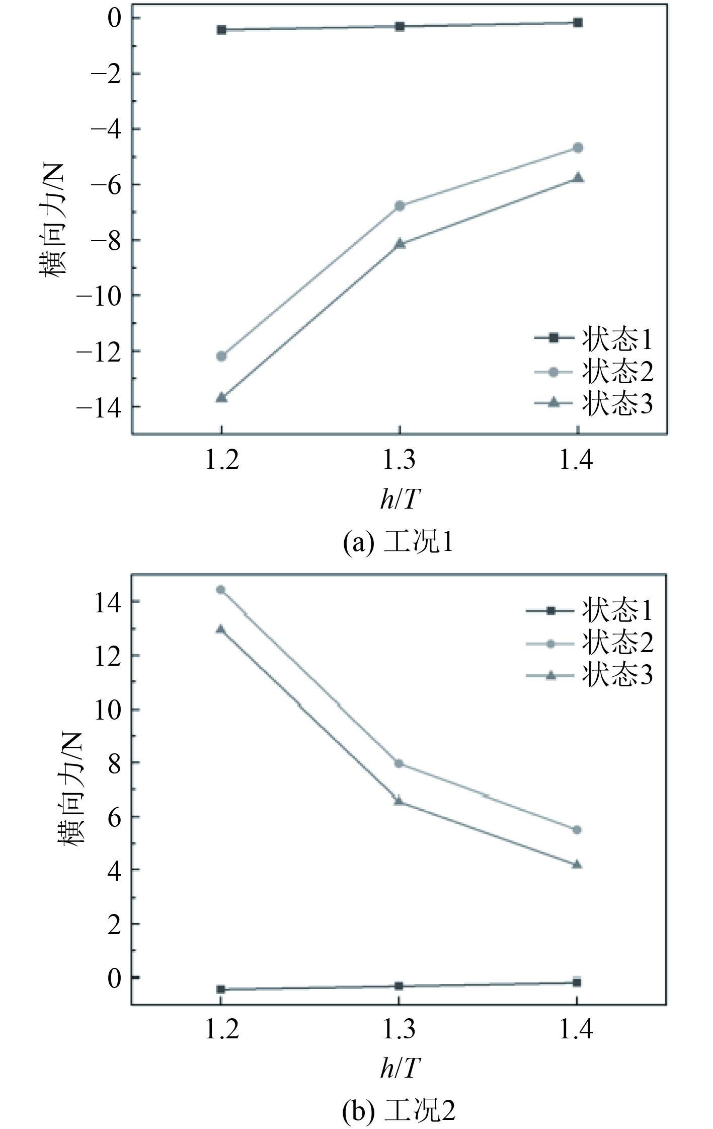 3)当流速增加0.103 m/s时,在水深吃水比(h/T)为1.2、1.3和1.4的工况下,横向水动力相较于工况1的11.775、6.476、4.503 N分别提升了26.11%、27.51%和26.07%。结果表明,流速对船舶保向性具有显著影响,其变化趋势表现为流速增大时,横向漂移速度随之增加,导致船舶在航行过程中更易偏离预定航线。