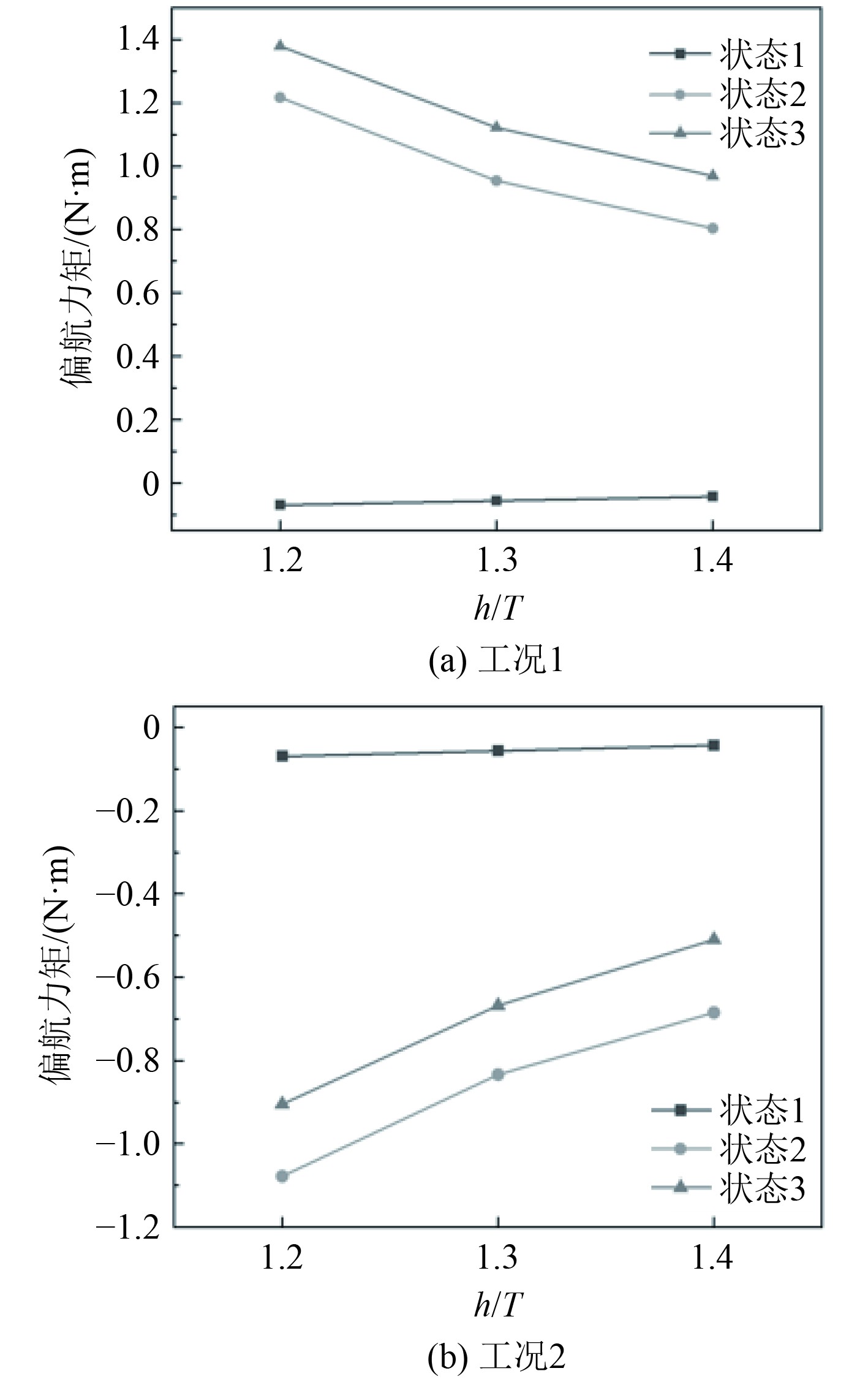 4.1 船体横向力对比分析如图5所示,船在3种状态下均会产生横向力和偏航力矩,同时对比2种工况中的状态2、状态3与状态1发现,受到风的影响时,横向力增加较为缓慢,因此流对船舶偏转作用特别显著,风对船舶的偏转影响次之。在无风无流状态下,船舶的横向力会随着水深的变浅而逐渐增大,即随水深吃水比(h/T)的减小呈递增趋势,在有风有流的状态下,船舶所受横向力随着水深的减小呈非线性成倍增加的趋势。无风无流的状态下,船舶在h/T=1.4下所受横向力为−0.167 N,随着水深的减小,船舶在h/T=1.3,1.2下产生的横向水动力分别增大了78.4%,151.5%,由此可见,当船舶处于浅水状态(1.2<h/T<1.5)时,流对船舶的操纵性将受到较明显的影响,船舶横向水动力会随着水深的减小而显著增大。当流自左舷正横前来,风自左舷正横后来(工况1)时,风流造成的横向力会形成“岸推效应”,使船舶偏离航道中心线航行,可以发现,船舶在h/T=1.4下所受横向力为−5.78 N,船舶在h/T为1.3、1.2下产生的横向水动力分别增大了41.2%、137.2%,可见,当受斜流和斜风作用时,由水深造成的横向水动力成倍增大,船舶的操纵性受到明显的影响,航向稳定性受到影响,对船舶保向、船舶靠离泊、船舶回转掉头的困难增加。当流自右舷正横前来,风自左舷正横后来(工况2)时,对比工况1的流速增加了0.103 m/s,在h/T为1.2、1.3、1.4下流产生的横向水动力对比工况1下横向水动力11.775、6.476、4.503 N分别增加了26.11%、27.51%、26.07%。可见,流速对船舶保向性有较大的影响,流速越大,船舶的横向漂移速度也越大,船舶在航行过程中更容易偏离规定的航线。对比2种工况下船舶所受风流状态的横向力对比发现,风对船舶造成的横向力不会随着水深的减小而增大,因此风对船舶的横向力主要取决于风速、风向,在风的作用下,水深变化对船舶保向性影响较为有限。