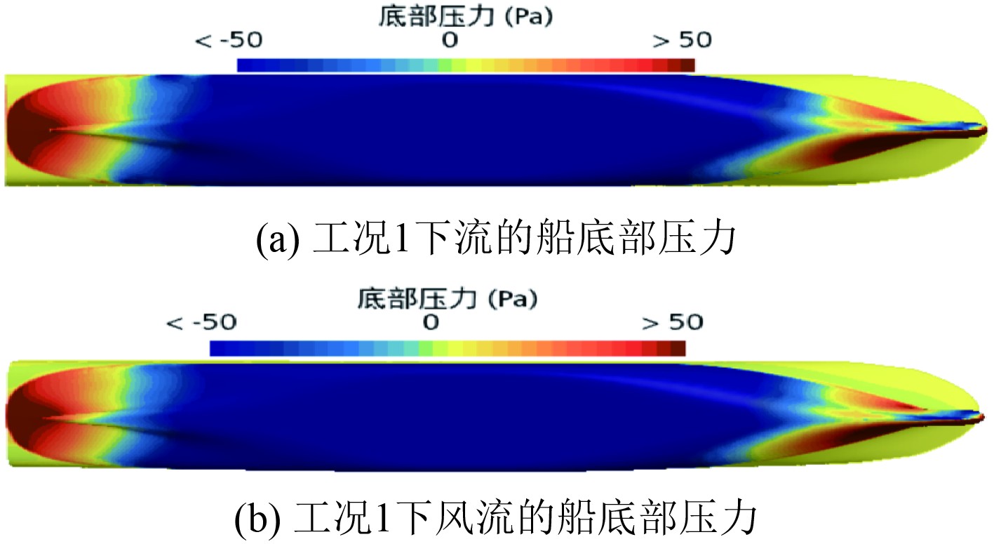 为更清晰地理解风对船舶的下沉量的影响,本文选取工况1(流自左舷正横前来,风自左舷正横后来)下h/T=1.2 时DTC受流、风流作用下在铜鼓航道航行时进行船底部动压力分析,图8为去除船底静压后的船底部动压力分布情况。可知,这2种状态均在船首、船尾处捕捉到了动压力,反应了浅水效应和斜顶流作用下船首尾的压力梯度变化,同时在船首处捕捉到了更大的动压力,这也解释了斜流在船首处产生局部高压区,会阻碍水流顺畅通过舷侧,使船底流速进一步增加,船体下沉这一现象。由于图8中顶部来流的状态一样,因此船首底部的最大动压力相等;图8(b)中船尾处来风,但是对船尾底部压力的变化几乎无影响,这也解释了风对船体下沉量和纵倾影响较小的原因。