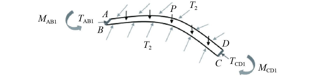 尽管薄膜理论的应用已非常成熟,但在解决封头筒体(耐压壳)时,由于筒体变形受到约束,在端部即容器筒体与封头连接处,会出现较大的弯曲应力,导致局部理论值与实际误差偏大。为解决这一问题,近年来部分学者开展了理论创新。文献[10]借鉴梁的弯曲理论,假设壳体的纵向弯曲行为可通过等效梁模型描述,即将壳体沿纵向划分为多条拱形梁,忽略部分横向剪切变形的影响,将非封闭母线双曲旋转薄壳的二维弯曲问题简化为一维壳带梁模型(见图2~图4),大幅降低了分析复杂度。
