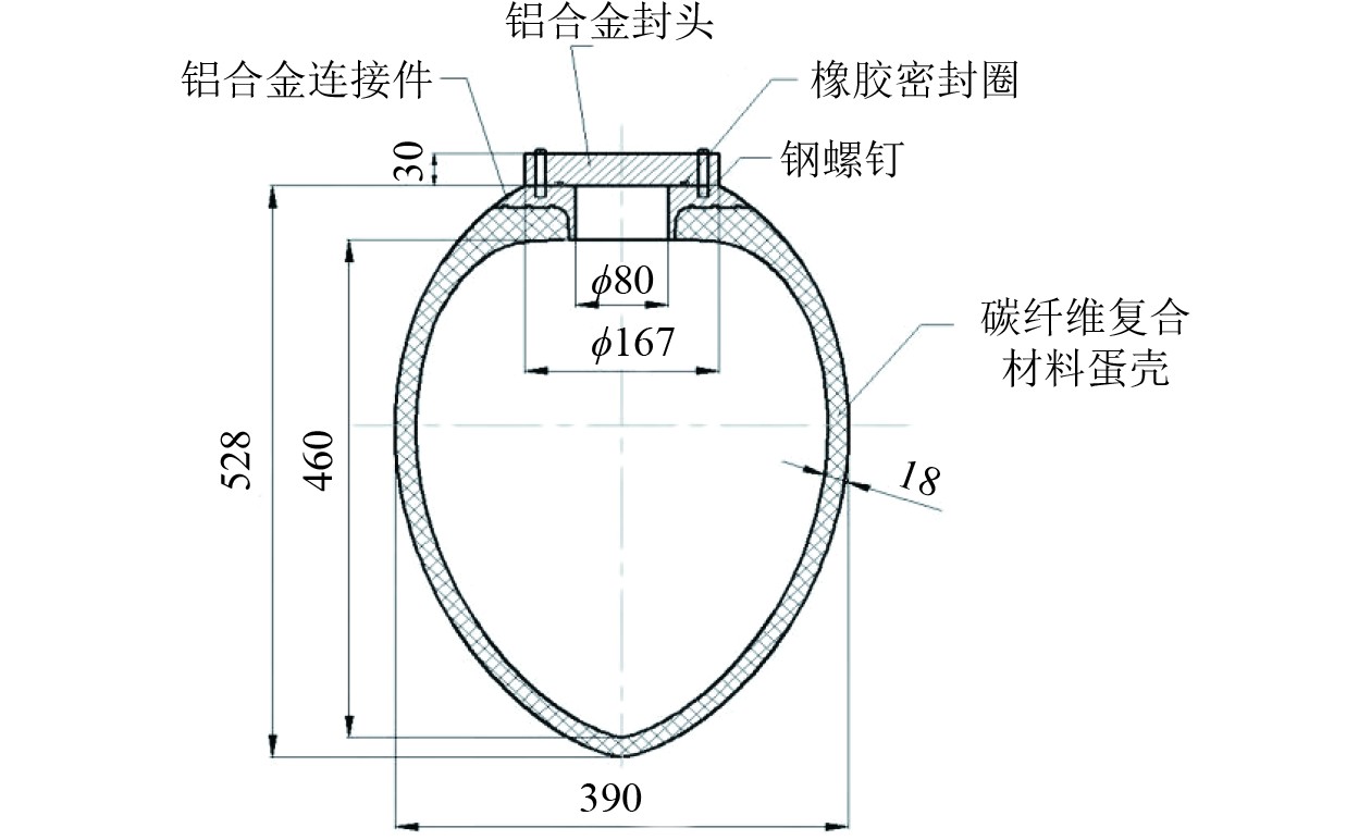 图 6 蛋形复合材料耐压壳模型设计[39](单位:mm) Fig. 6 Design of pressure resistant shell model for egg shaped composite material (unit: mm) |