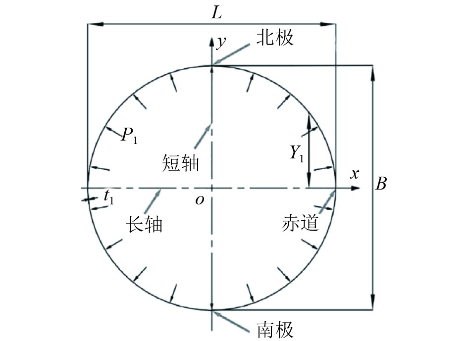 文献[5]基于薄膜理论分析了椭圆环面扁壳的力学行为,文献[6 − 8]基于薄膜理论推导了封闭母线的蛋形耐压壳(见图1)强度载荷公式(如式(4)),文献[9]对非封闭母线双曲率旋转壳承载能力进行了探讨,结果表明相较于圆柱壳,双曲率壳体具有明显的承载优势。
