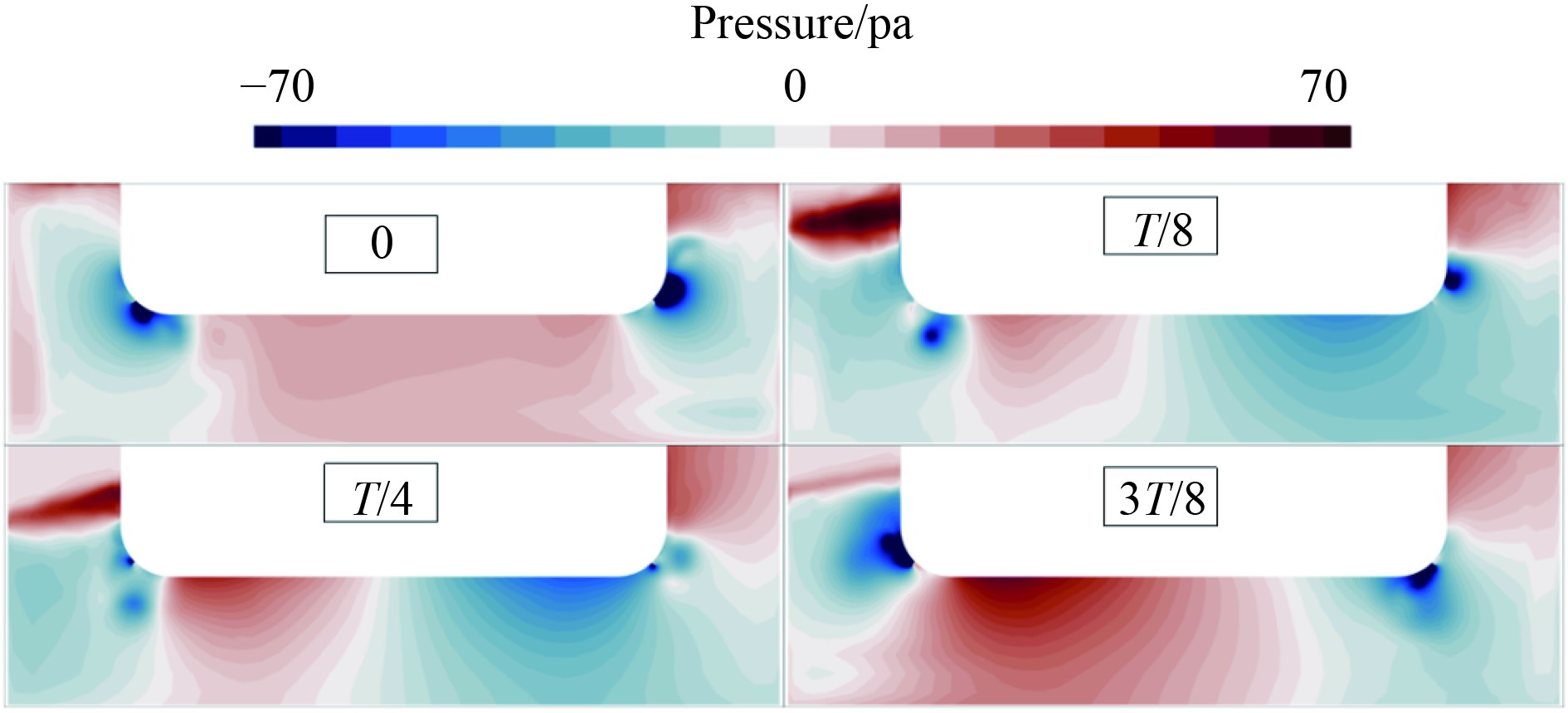 低压区位置与2.3.1节分析的旋涡生成位置一致,表明低压区是由旋涡诱导产生的。从流体微团的受力平衡角度分析:作曲线运动的流体微团受离心力作用,有向外运动的趋势;为维持其旋转运动,流场内部需形成由外指向内的压力梯度力,以此作为向心力来平衡离心力。因此,压力沿旋转半径向外递增,旋转中心成为压力最低的区域。旋涡强度越大,则离心力越大,所需的向心力(即压力梯度)也越大,因此低压区的强度与旋涡强度呈正相关。