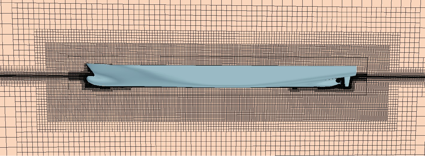 计算域网格采用切割体网格生成器进行划分,并引入了表面重构模型以进一步提升网格质量。为精确捕捉关键流动现象,对网格实施了局部加密策略:在舭龙骨、艏部及艉部等易发生流动分离的区域进行了加密,以解析复杂的旋涡结构生成与演化;在船体周围的自由液面区域实施了加密,旨在精确模拟横摇运动引发的兴波现象,网格划分如图2所示。