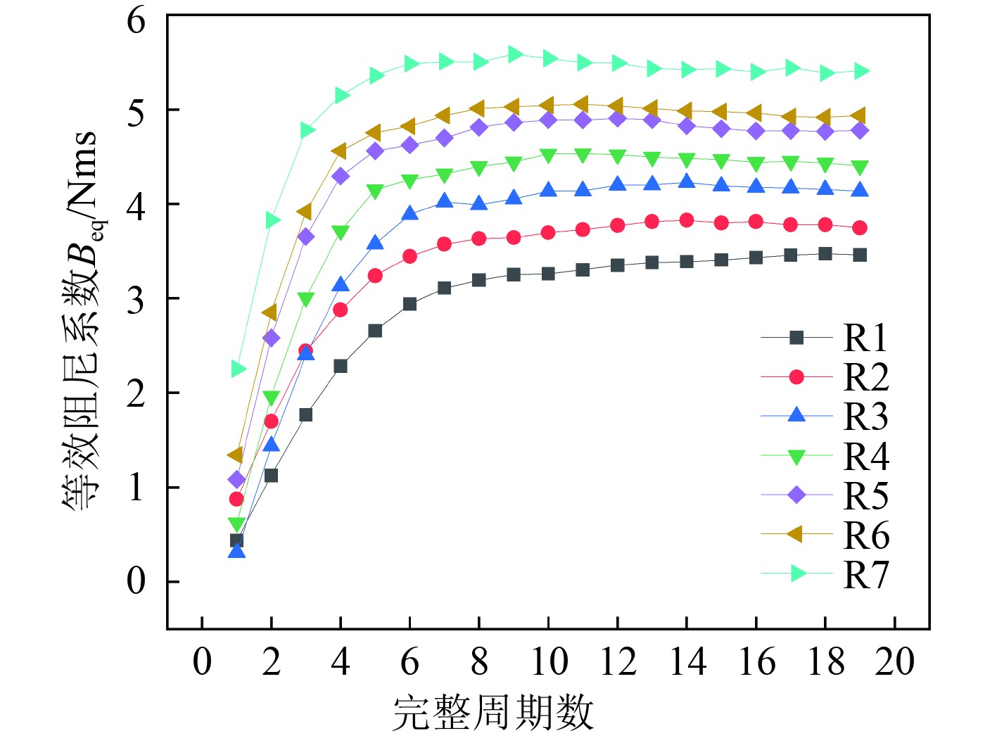 采用 1.5 节所述的、包含激励力矩项的 Froude 能量法计算各工况的横摇阻尼。此处将横摇运动曲线两个相邻正峰值之间的区间定义为一个完整周期。图6为R7工况等效阻尼系数随时间的变化。可以看出,等效阻尼系数的变化分为递增阶段和稳定阶段,分别对应横摇运动的幅值增长阶段和稳态横摇阶段。