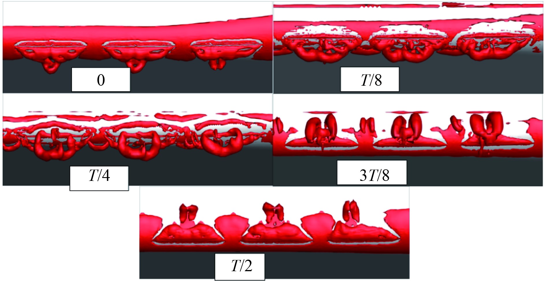 图 7 R4工况一个周期的旋涡识别时刻 Fig. 7 Instants of vortex identification within one rolling period for case R4 |