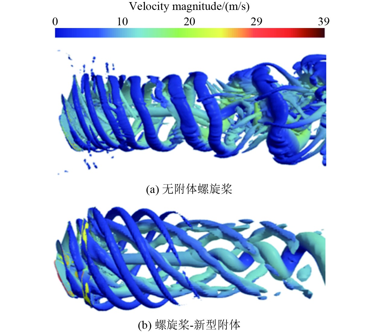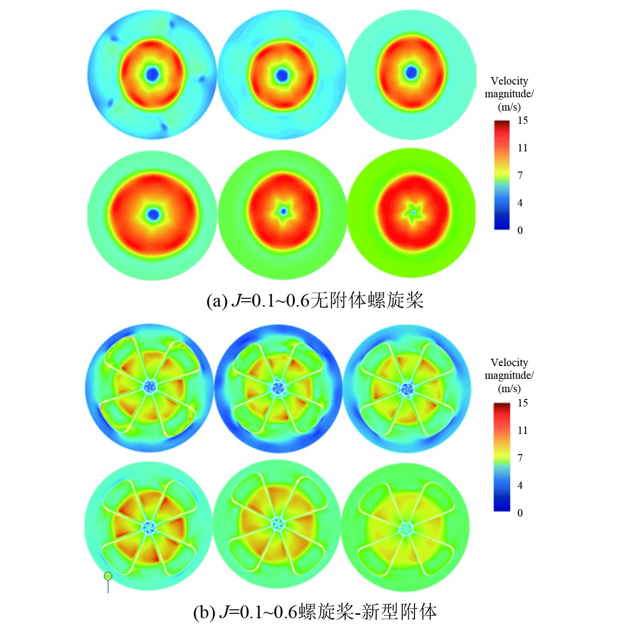 综上所述,新型附体在斜流条件下对螺旋桨尾流涡结构的优化作用显著,通过改善尾流核心区域的速度分布和削弱叶梢涡与桨毂涡的相互作用,有效降低了尾流能量损耗,提升了推进效率和航行器的姿态稳定性。