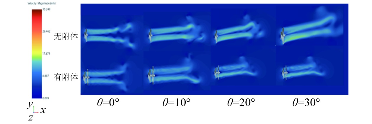 如图13所示,展示了设计工况J=0.4下螺旋桨加装环形附体前后在不同斜流角度下的中纵剖面速度场变化情况。在螺旋桨叶梢处,由于螺旋桨桨叶的周期性切割作用,叶梢涡形成了锯齿状的高速区。随着斜流角度的增加,无附体螺旋桨的高速区强度普遍高于加装附体螺旋桨,且其宽度更大;加装附体螺旋桨的高速区相较于无附体螺旋桨更难以维持,新型附体的能量回收作用使螺旋桨尾流场受斜流影响较小。从斜流角度