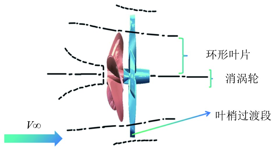本文提出的一种环形自由旋转叶轮附体,其模型展示于图1(a),其中土黄色部分代表KP505螺旋桨,蓝色部分则为新型附体。图1(b)进一步展示了该附体的结构细节。该新型附体主要由消涡轮和环形叶片这2个关键组件构成。具体而言,消涡轮由圆台、旋流定子以及整流叶片共同组成,这些部件均被精确安装于导管之内。环形叶片则是从每个桨叶的叶梢处进行弯曲处理,进而连接至相邻叶片的叶梢,最终形成一个完整的环状结构,并被牢固安装于消涡轮的上方。该新型桨后附体的工作原理如图2所示,在螺旋桨推进过程中,水流经螺旋桨后会流经桨后附体的消涡轮和环形叶片部分,桨后附体涡轮实现自身旋转;在此过程中,尾流能量被有效回收利用,附体的叶梢过渡段将回收的能量转化为正向推力。此外,水流经由消涡轮流入,其中的旋流片和整流叶片对水流起到调节作用,从而实现消涡效果。该附体能够对桨后水流进行调控,实现尾流能量的多级利用模式,进而提高螺旋桨的推进效率。