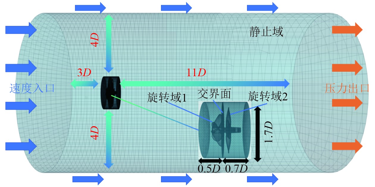 为了深入研究螺旋桨及桨后附体水动力特性,本文采用了高精度的数值模拟方案。将计算区域分为静态区域与旋转区域两部分,借助滑移网格技术开展数值模拟。为了在保持结构化网格几何拓扑的同时降低计算资源消耗,将流场划分为外部静态区域和2个较小的内部旋转区域,如图3所示。