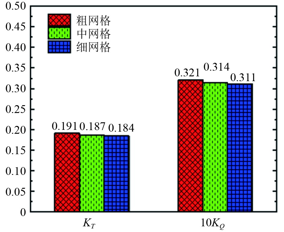 采用CFD方法进行数值模拟时,网格基础尺寸的合理选择对于确保模拟结果的精度具有重要意义。本文模拟严格遵循国际拖曳水池会议(ITTC)所推荐的相关标准,对网格尺寸的变化率进行了科学合理的设定。表3呈现了3种不同网格尺寸设置下的对比情况。在J=0.7时开展网格独立性验证计算,其结果如图5所示,经分析发现不同网格设置之间的相对误差均被有效控制在3%以内,尤其是细网格与中网格之间的误差表现得更为微小,几乎可以忽略不计。本文仿真计算中时间步长取为