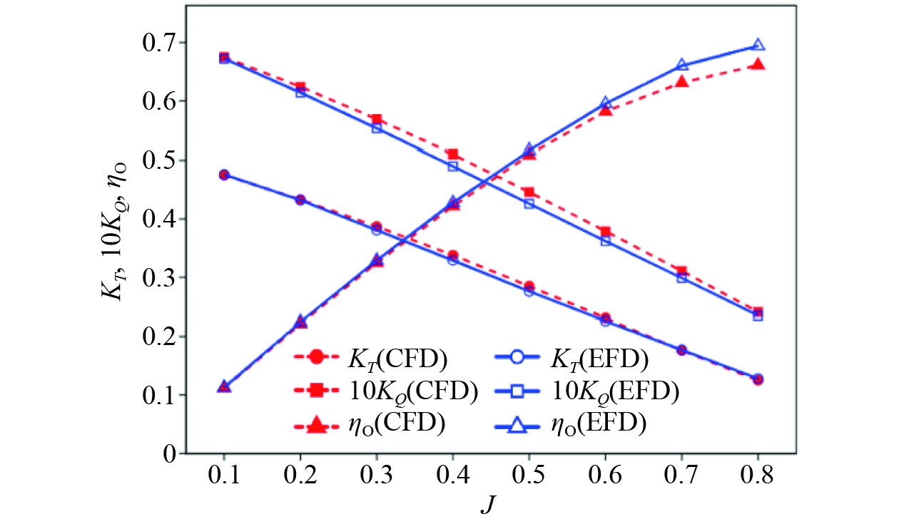 图 7 螺旋桨敞水性能数值结果与试验对比 Fig. 7 Comparison of results with experimental data |