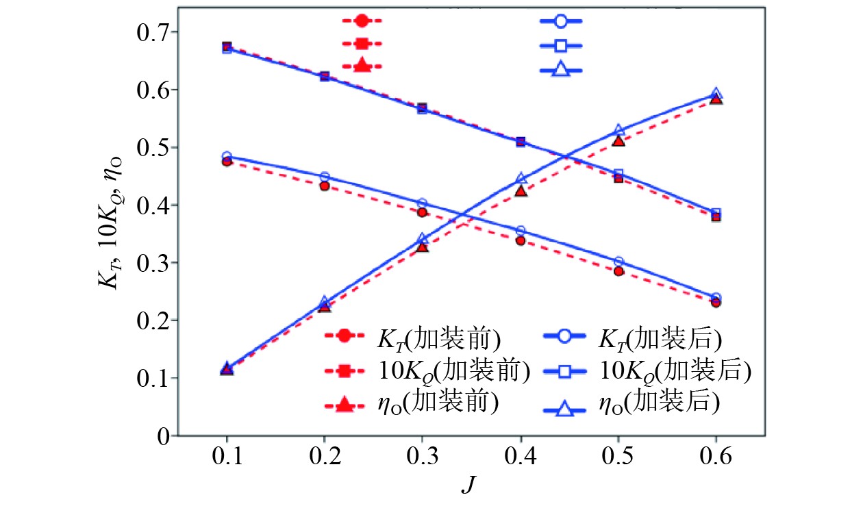 图 8 螺旋桨与新型附体敞水性能数值结果对比 Fig. 8 Comparison of open-water performance of propellers with new attachment |
