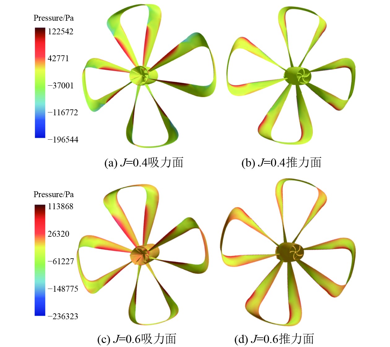 进一步针对J=0.4和J=0.6进速系数下的桨后压力情况进行分析,探讨新型附体如何通过压力分布的变化来提升推进性能,如图9所示。可知,J=0.4时新型附体表面压力变化主要集中在涡轮区域和叶梢过渡段,径向压力分布的分层特征在叶梢和消涡轮区域尤为显著。在叶梢过渡段,最大表面压力出现在推力面,而最小压力则位于吸力面,这种压差直接产生了与推进方向一致的附加推力。环形叶片的压力分布与螺旋桨相反,推力面的压力低于吸力面,从而产生反向力和回转力矩,促进附体旋转以回收能量。然而在J=0.6工况下,压力分布与设计进速时相比出现差异,分层特征减弱,吸力面与推力面的压力差异减小,可能导致推力降低而阻力增加,进而削弱新型附体在高进速系数下的节能效果。