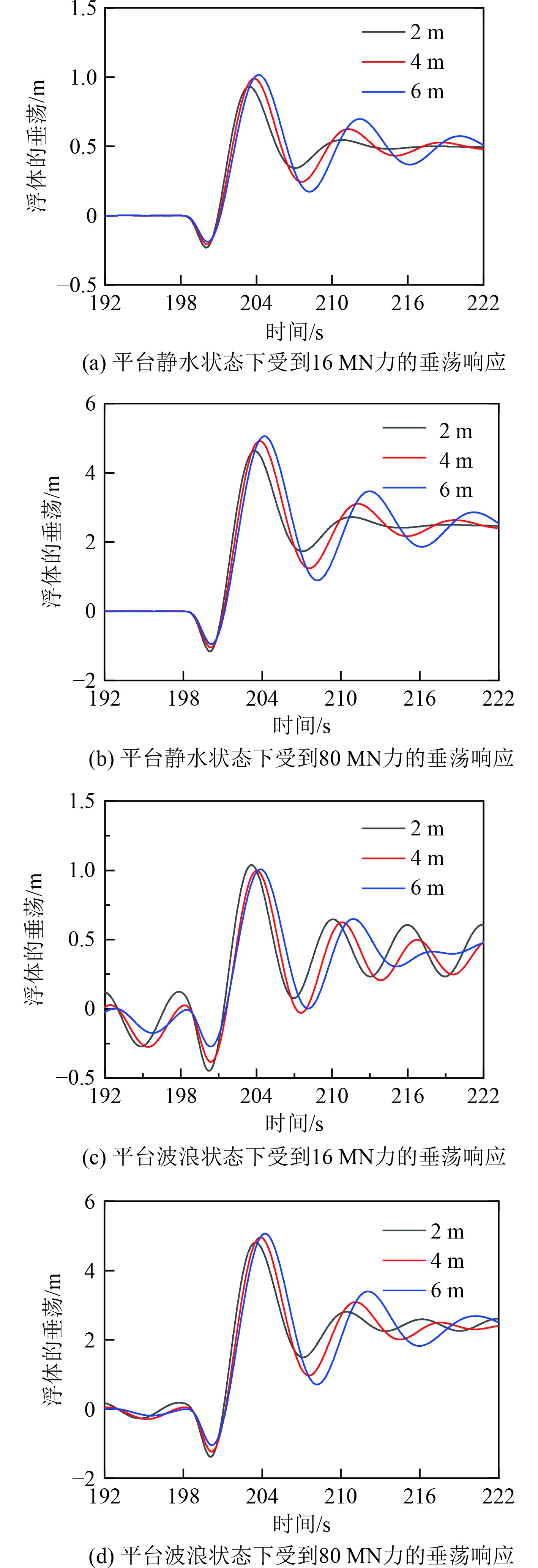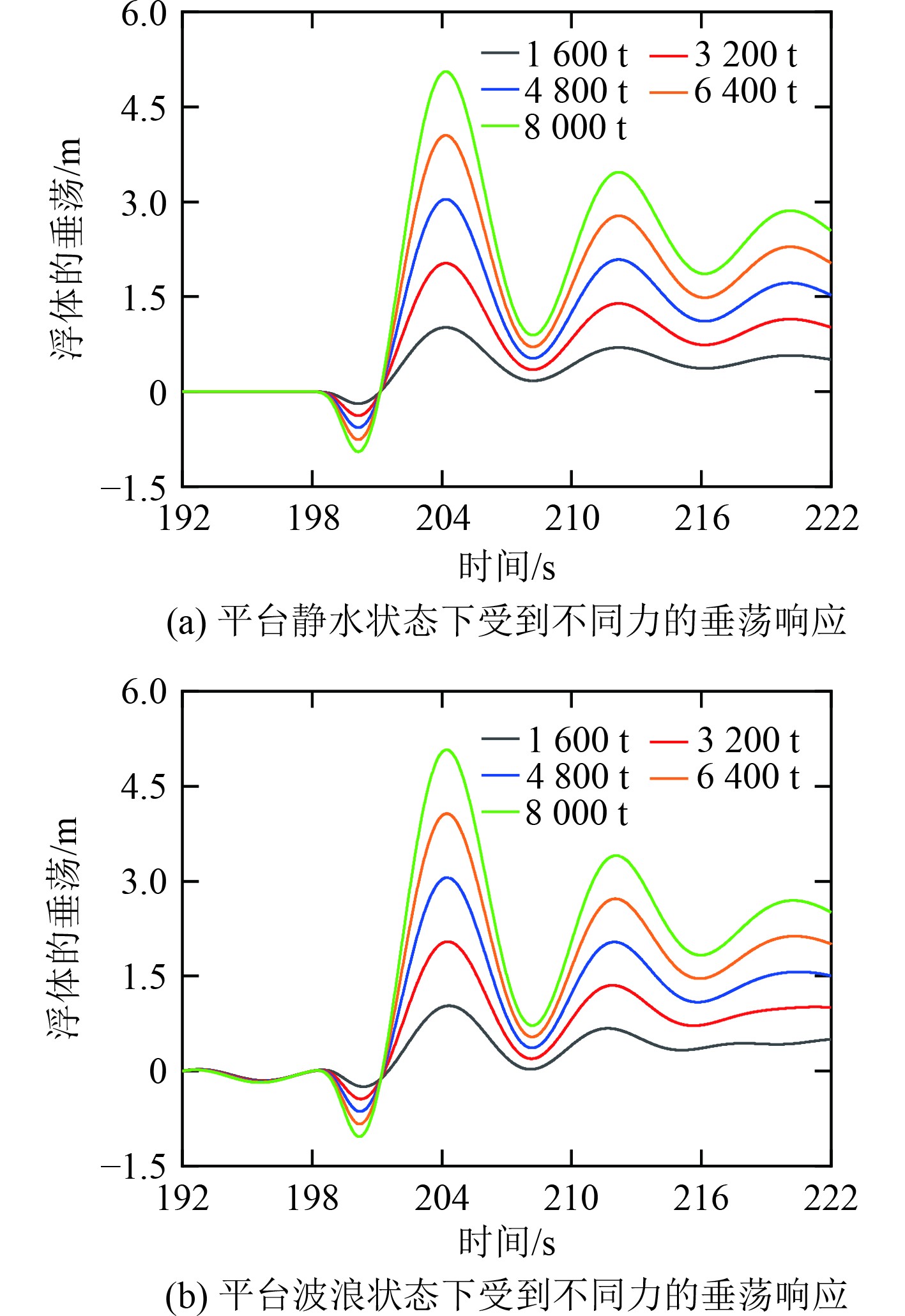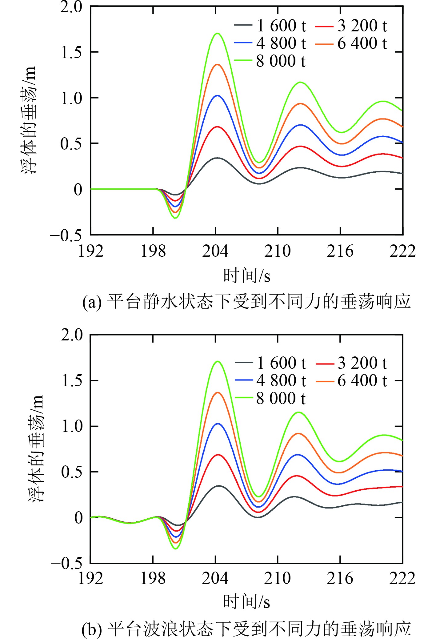 不同吨位的火箭对发射平台的响应会产生不同的影响。采用的规则波浪波高为1 m,周期为6 s,浪向为0°。选取平台吃水为6 m,受到不同冲击载荷情况下的平台垂荡响应结果进行分析。