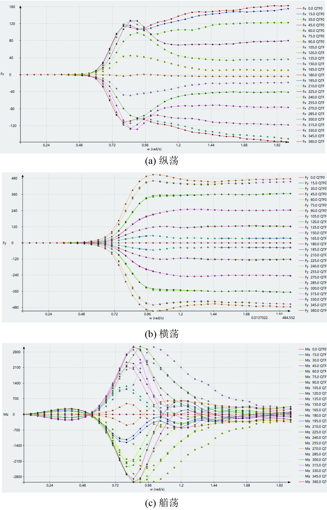 使用HydroStar软件对锚泊工况进行耐波性运动响应预报。图1为该船的二阶波浪载荷响应曲线,纵向FX、横向FY以及艏摇MZ二阶波浪载荷。