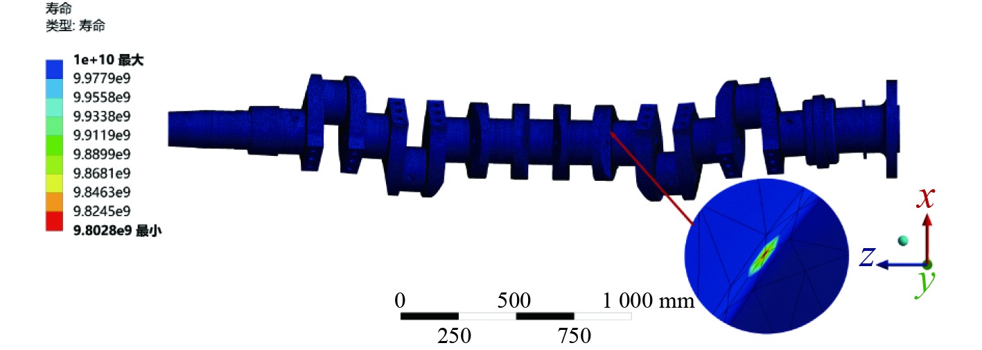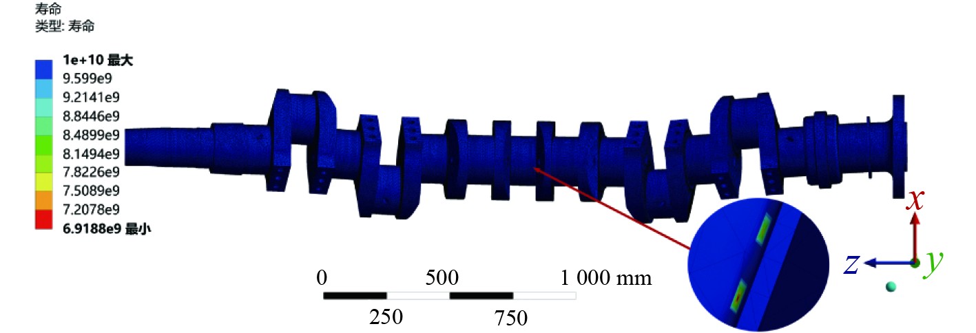 通过Ansys Workbench疲劳分析工具对船舶曲轴进行疲劳计算,得到疲劳寿命云图如图5所示。分析可知,船舶曲轴的疲劳寿命薄弱区主要集中在曲轴主轴颈与曲柄臂过渡圆角处,以及曲轴中间2个曲柄臂及其相邻的主轴颈位置,与应力分析结果一致。该位置疲劳寿命较低的主要原因是在曲轴运动的过程中出现了应力集中现象。分析结果表明,曲轴寿命最小循环次数为