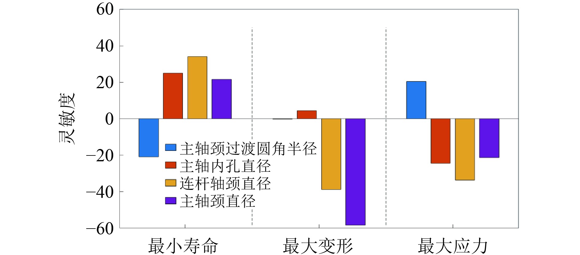灵敏度分析柱状图如图6所示。可知,对寿命和应力影响最大的是主轴内孔直径和连杆轴颈直径,对变形影响最大的是连杆轴颈直径和主轴颈外直径,所有设计变量灵敏度都较高。以寿命为例,从其相关性来分析,主轴颈过渡圆角与寿命呈负相关,寿命则随着主轴颈过渡圆角的增大,寿命反而减小;其他3个参数与寿命成正相关,寿命则随着参数的增大而增大。