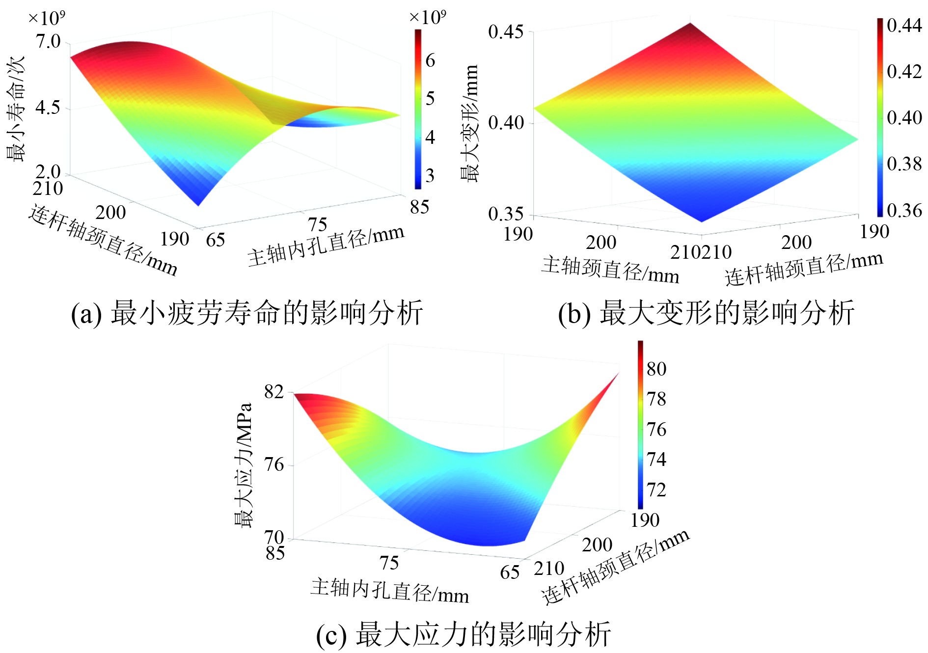 图7中,在空间直角坐标系中响应面表示输入参数和优化目标之间的关系,坐标系中的x轴和y轴为曲轴结构输入参数的大小,z轴为曲轴输出参数优化大小。可知,x轴和y轴间呈现非线性交互效应,与z轴共同构成非线性响应面图,其特征符合曲轴结构参数与寿命等的非线性性质。疲劳寿命与连杆轴颈直径呈现非线性增长,变形和应力随着连杆轴颈直径的减小而非线性增大,与灵敏度图分析一致。