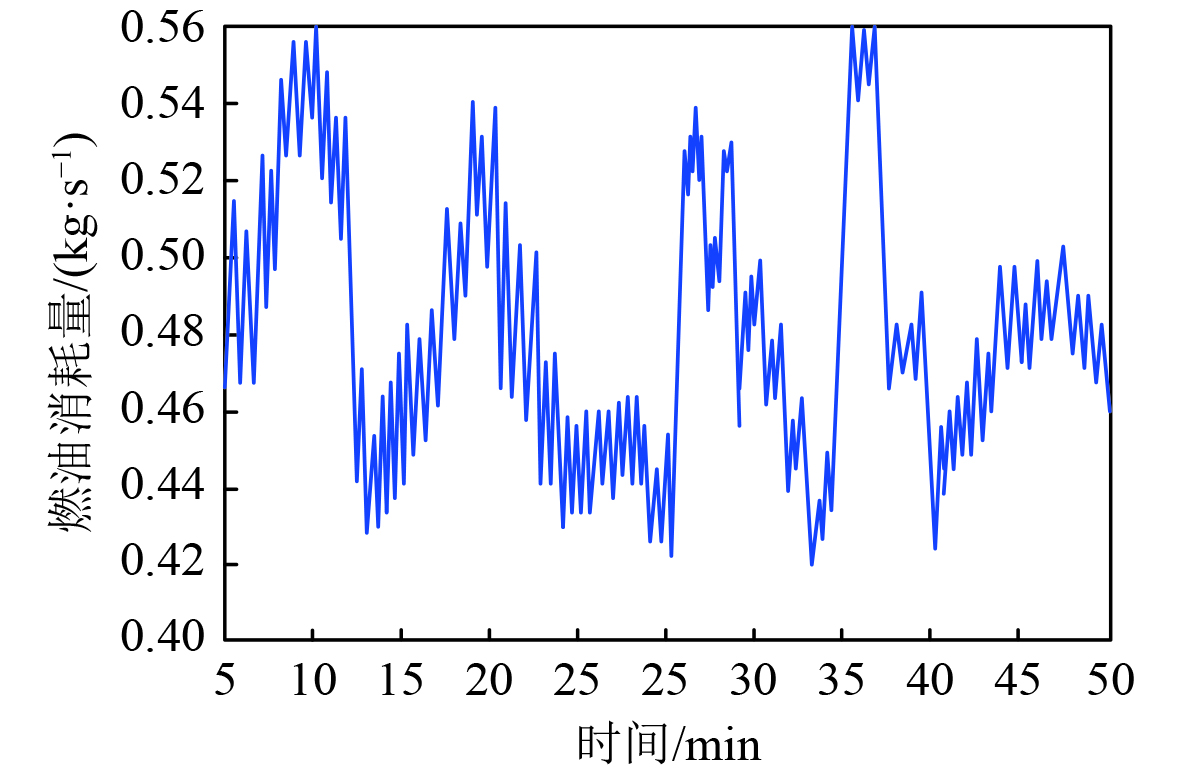 分析可知,本文方法可有效计算舰船的实际燃油消耗量,在航行5~50 min时,该舰船的实际燃油消耗量大概在0.42~0.56 kg/s之间波动,整体处于较高耗油区间。燃油消耗量表现出明显的非稳态波动,无稳定平台期,反映恶劣海况下外部干扰对燃油消耗存在显著影响。