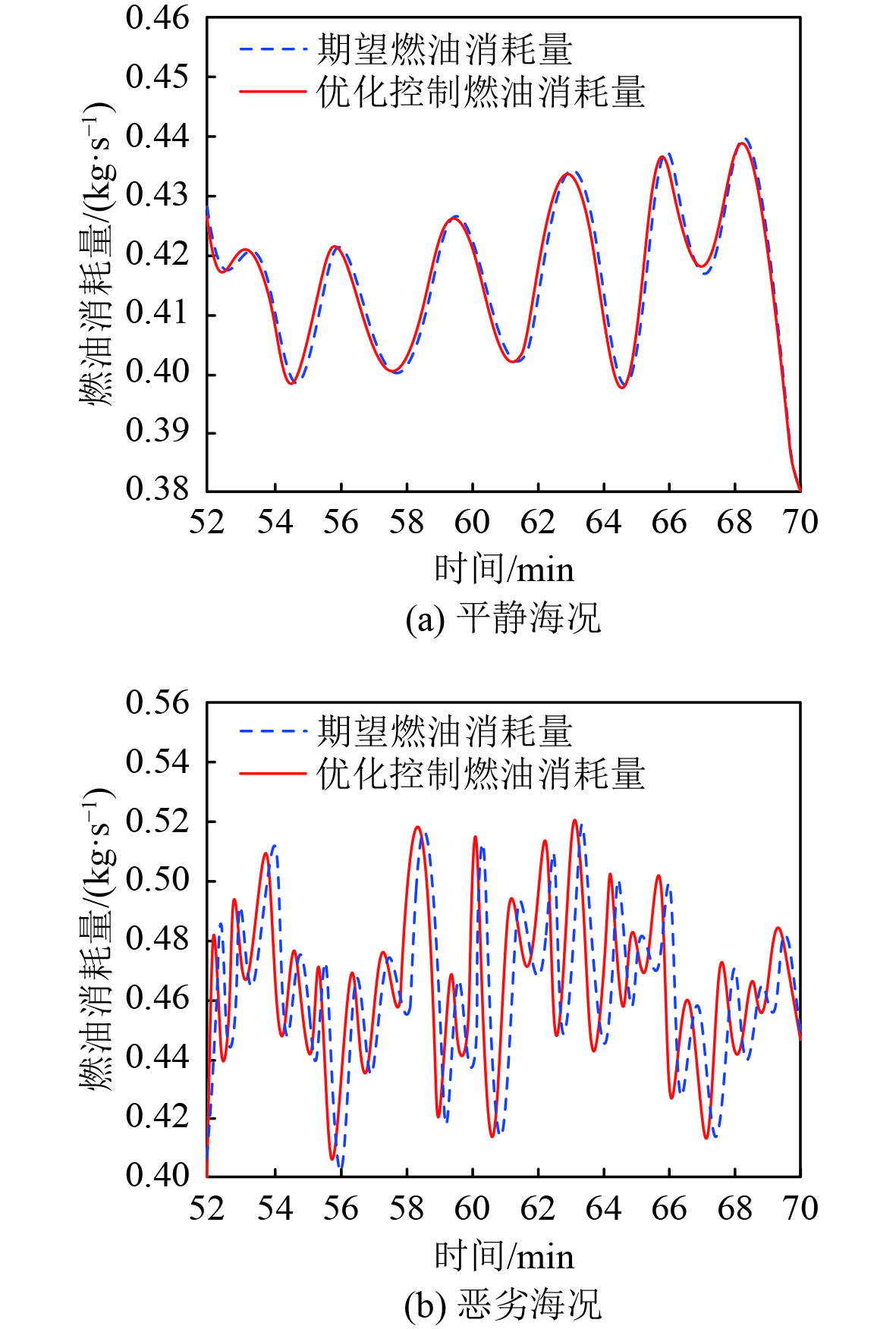 在平静海况与恶劣海况下,利用本文方法预测该舰船的期望燃油消耗量,并进行燃油消耗优化控制,燃油消耗优化控制结果如图2所示。