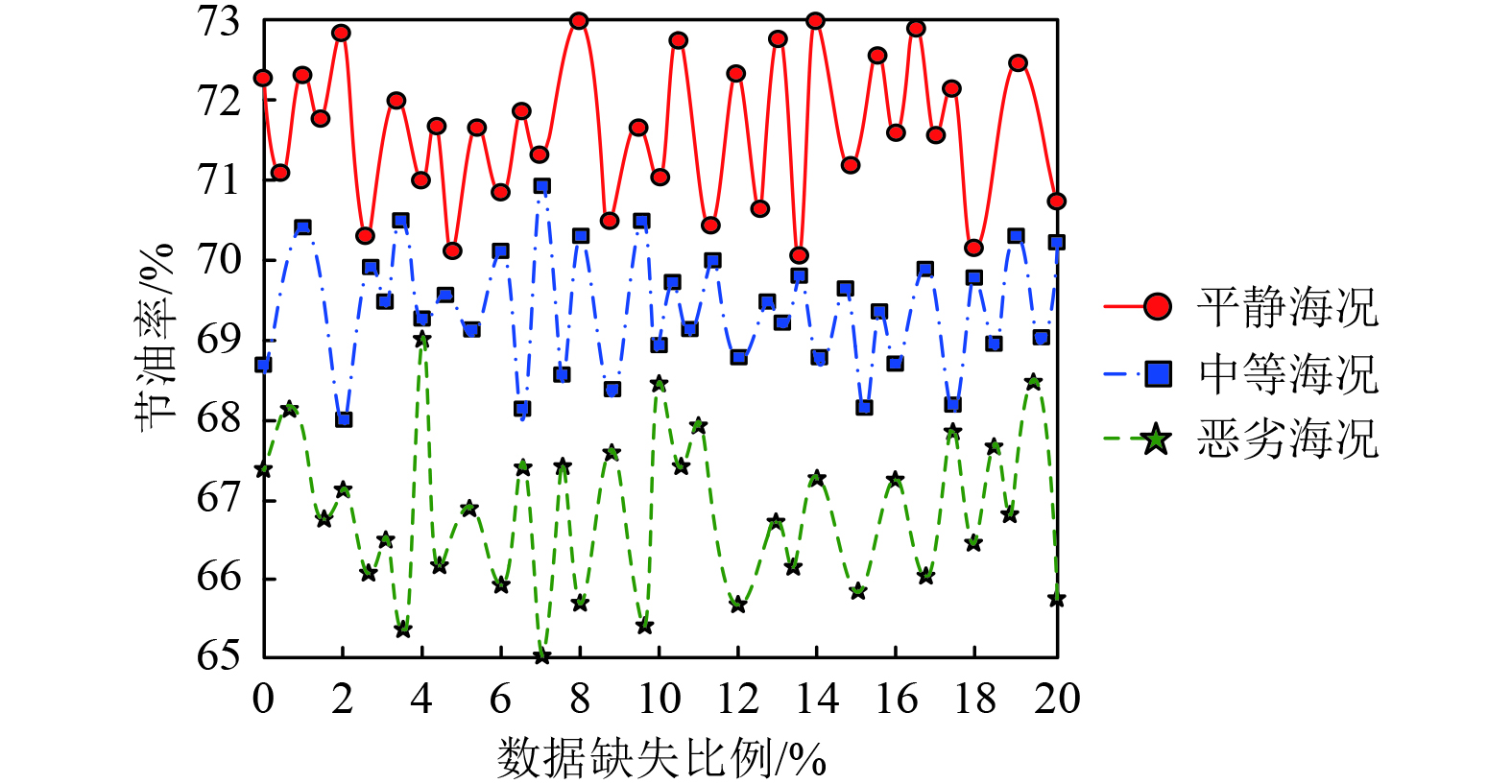 分析可知,不同海况以及不同数据缺失比例下,本文方法均可完成舰船燃油消耗优化控制,经过本文方法优化控制后,平静海况节油率主要在70%~73%之间波动,说明在低干扰环境中,本文方法能充分发挥优化控制性能。中等海况的节油率主要在68%~71%之间波动,相比平静海况节油率呈轻微下降趋势,反映动态干扰对控制精度的影响。恶劣海况的节油率主要在65%~69%,虽受环境影响节油率有所下降,但仍具备良好的节能潜力。