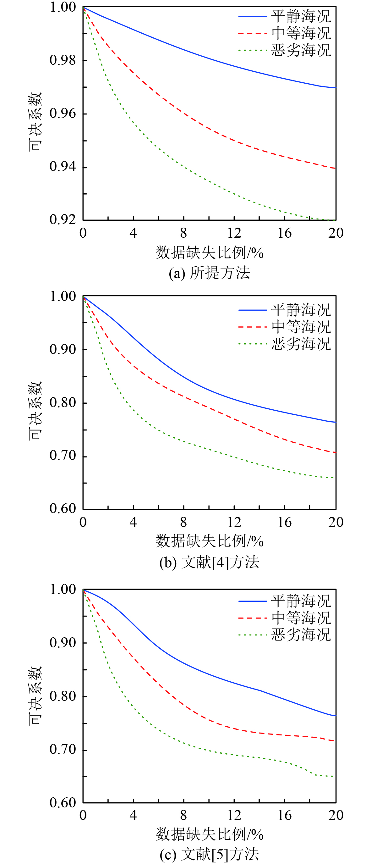 分析可知,3种舰船航行海况下,随着数据缺失比例的提升,期望燃油消耗量预测的可决系数均呈下降趋势。所提方法在不同数据缺失比例下,可决系数均高于文献[4]和文献[5]方法。即使在数据缺失比例达到20%时,在平静海况下可决系数仍接近0.98,中等海况下约为0.96,恶劣海况下约为0.92,显示出较强的稳定性和较高的预测精度。文献[4]方法在3种海况下的可决系数整体低于所提方法。随着数据缺失比例的增加,其预测精度下降较为明显,在恶劣海况且数据缺失比例达到20%时,可决系数降至约0.60。文献[5]方法的可决系数在3种方法中相对最低。在恶劣海况和数据高缺失比例的情况下,其预测精度表现较差,当数据缺失比例达到20%时,可决系数约为0.65左右。