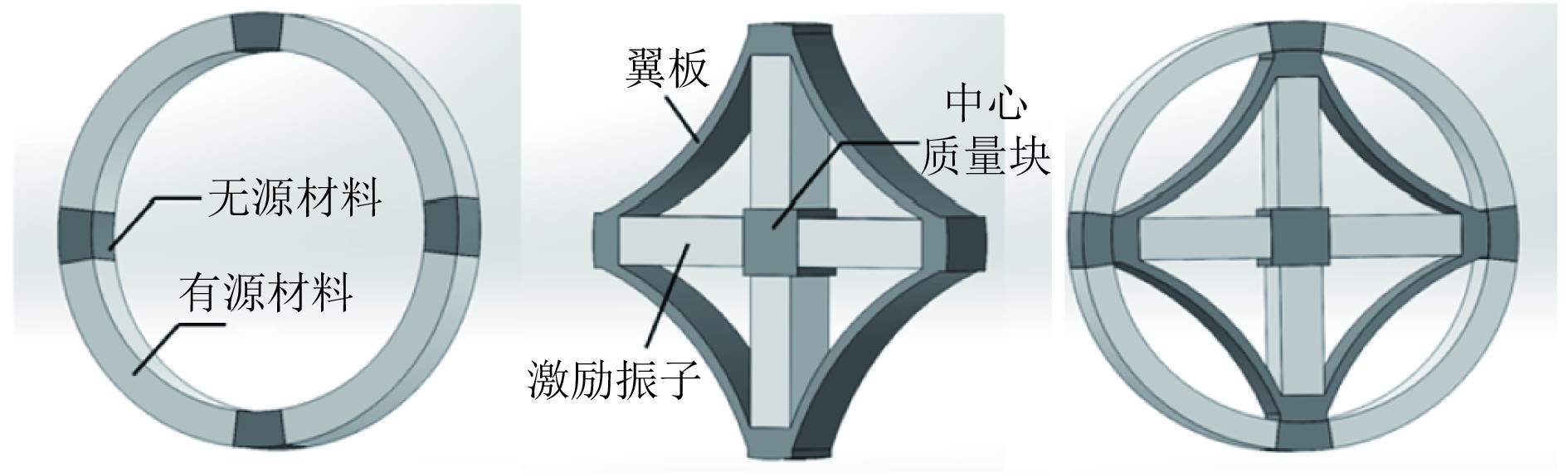 1 管梁耦合换能器结构与分析方法 1.1 结 构本文设计的管梁耦合换能器如图1所示。圆环换能器中加入弯曲梁翼板,组成管梁耦合复合结构,再在其中加入激励振子和中心质量块。圆环中的有源材料和激励振子选择PZT-4压电陶瓷;圆环中的无源材料、弯曲梁翼板和中心质量块为铜。翼板结构本身具有声辐射能力,可以在圆环径向振动模态之外增加新的有效工作模态,加入激励振子和中心质量块,提高机械振动的同时增加更多的模态谐振。利用多模态谐振,调整几何参数,控制工作频段。