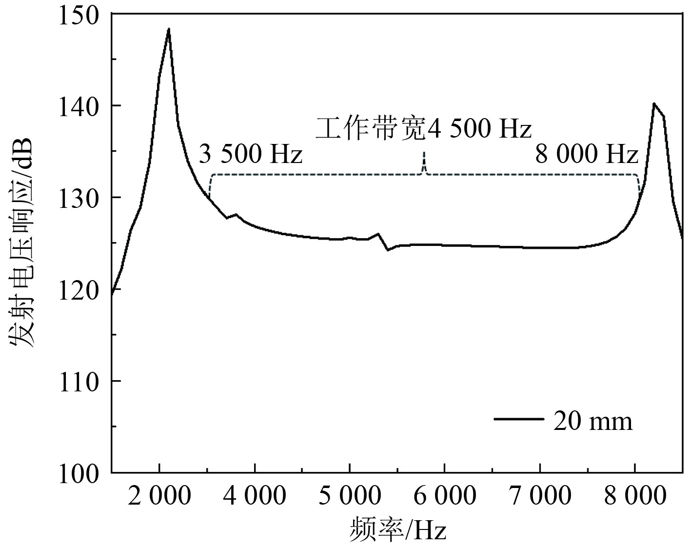 换能器参数确定为最大直径300 mm,圆环厚度20 mm,圆环中无源材料占比2/15;翼板厚度5 mm,曲率半径300 mm;中心质量块边长40 mm;整体高度20 mm。最终的发射电压响应如图12所示。