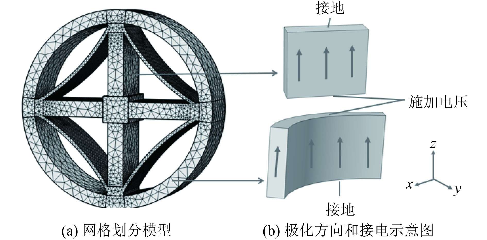通过初步设计建模如图2所示。图2(a)为3D网格模型,将连续的几何模型离散化为由有限单元组成的网格,从而将复杂的物理场问题转化为计算机可处理的数值计算问题。如图2(b)所示,圆环和激励振子都采用相同的 Z 向极化,施加电压方向相反。