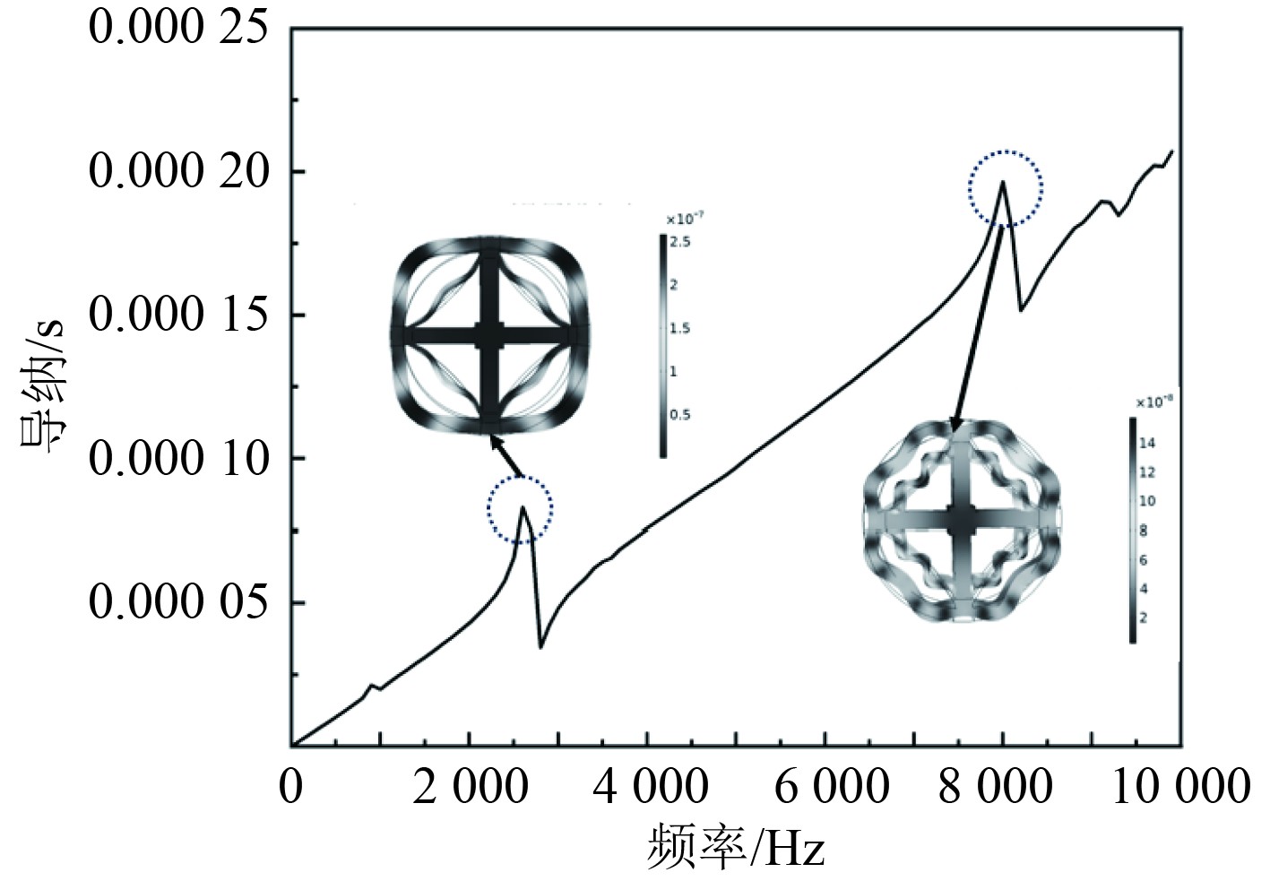 图 3 导纳曲线及峰值模态图 Fig. 3 Admittance curve and peak mode diagram |
