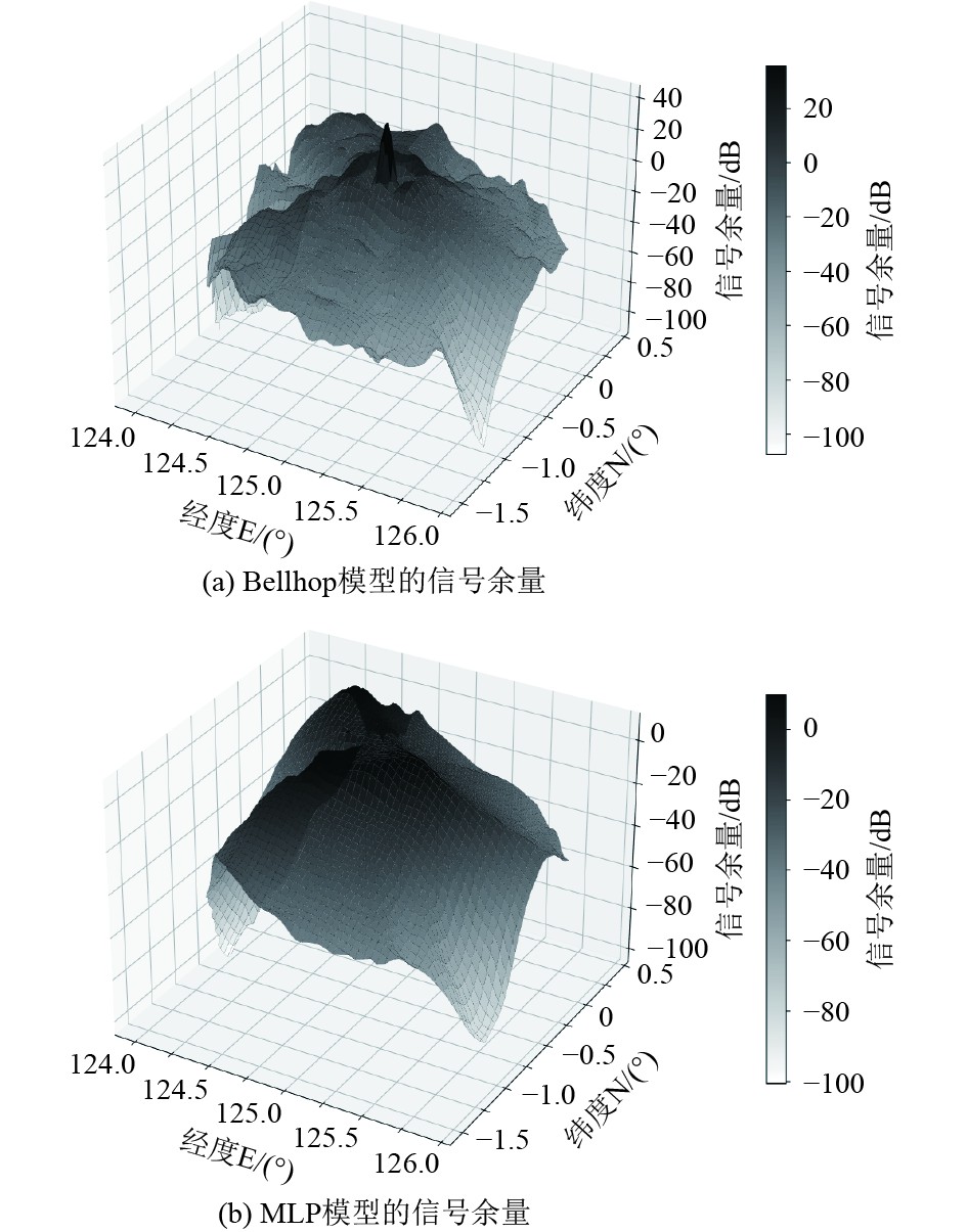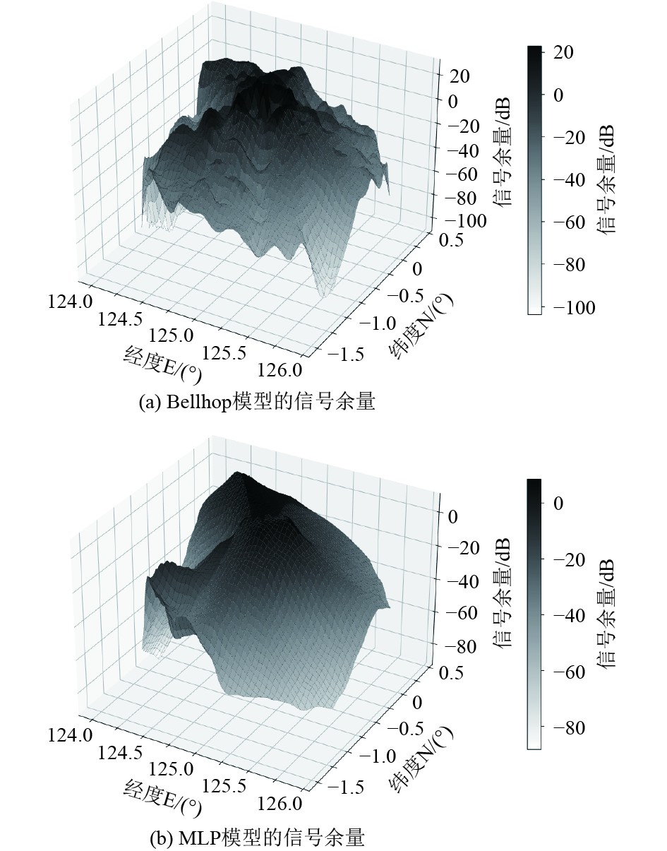 3 信号余量预测潜艇航行在不同的深度层,分别用Bellhop模型和MLP模型计算信号余量,结果如图10~图12所示。