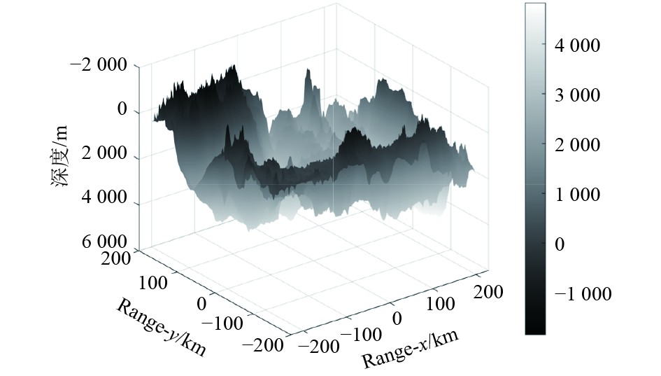 2 实验仿真 2.1 区域选择本文选取菲律宾南部的马鲁古海及其附近海域作为研究区域,图5和图6为马鲁古海附近的海底地形的二维平面图和三维立体图,可以看出该区域的地形较为复杂,高度差异大,有明显的山脊和深谷结构。