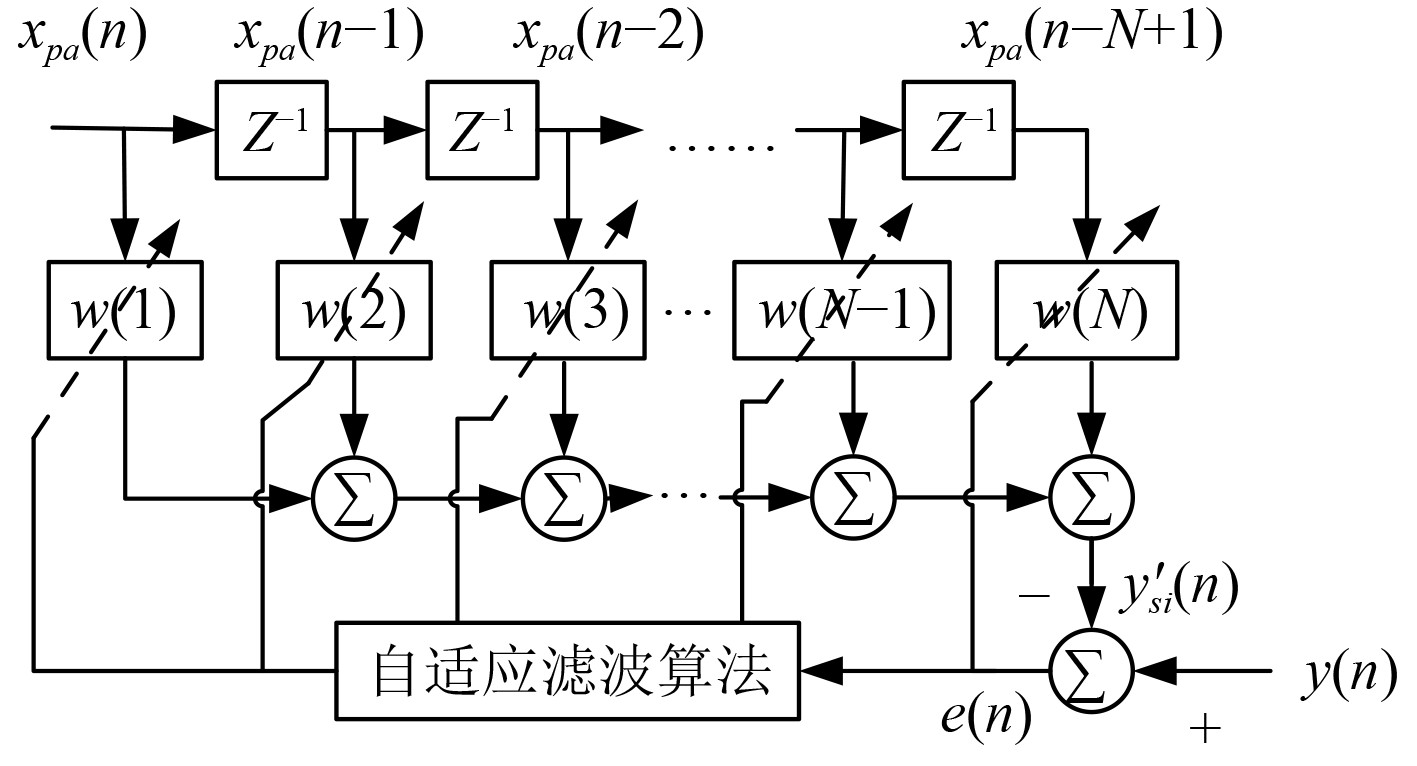 | $ \begin{split}e(n)=&y(n)-y_{si}^{\prime}(n)=y(n)-{\boldsymbol{w}}^{\mathrm{{T}}}(n){\boldsymbol{x}}_{pa}(n)=\\&{r}_{ds}(n)+{r}_{si}(n)+v(n)-{\boldsymbol{w}}^{\mathrm{{T}}}(n){\boldsymbol{x}}_{pa}(n)。\end{split}$ | (9) |