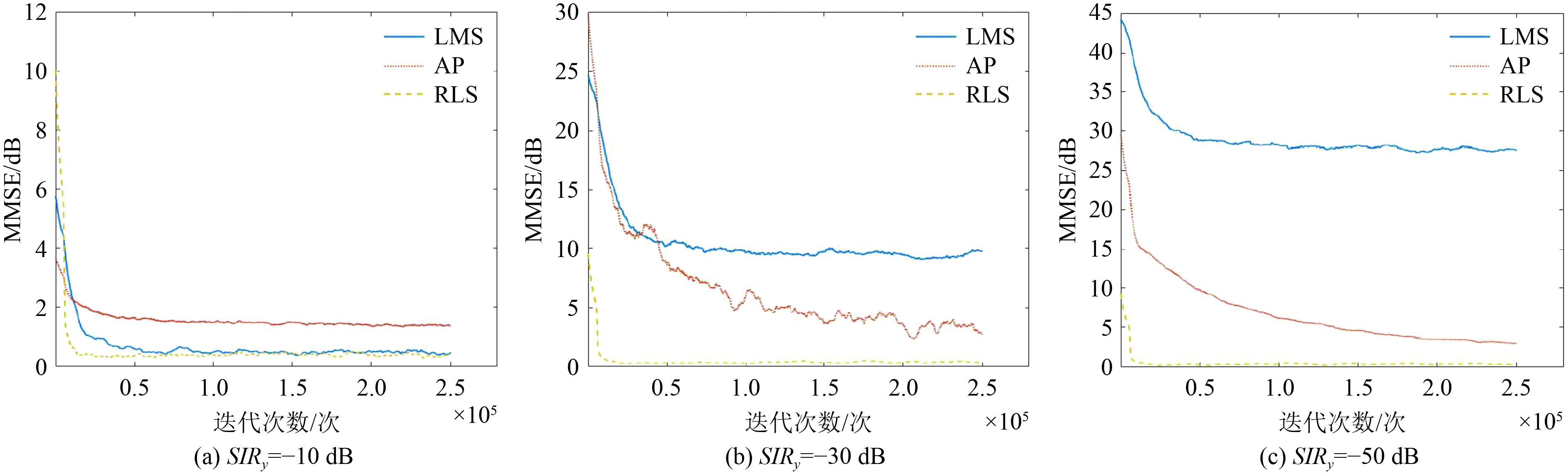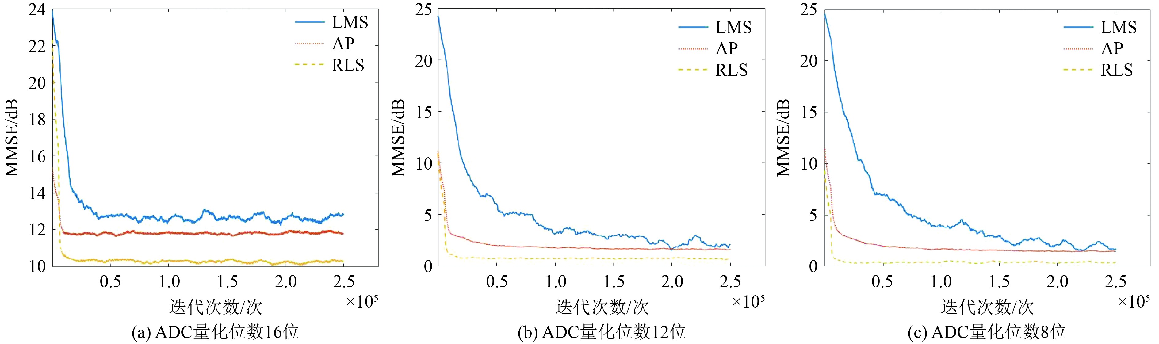 为研究对比3种算法在接收信号信干比不同时的收敛特性和抵消性能,辅助支路ADC采用高量化位数(24位)以尽可能减少辅助支路量化噪声对研究结果的影响,接收信号信噪比