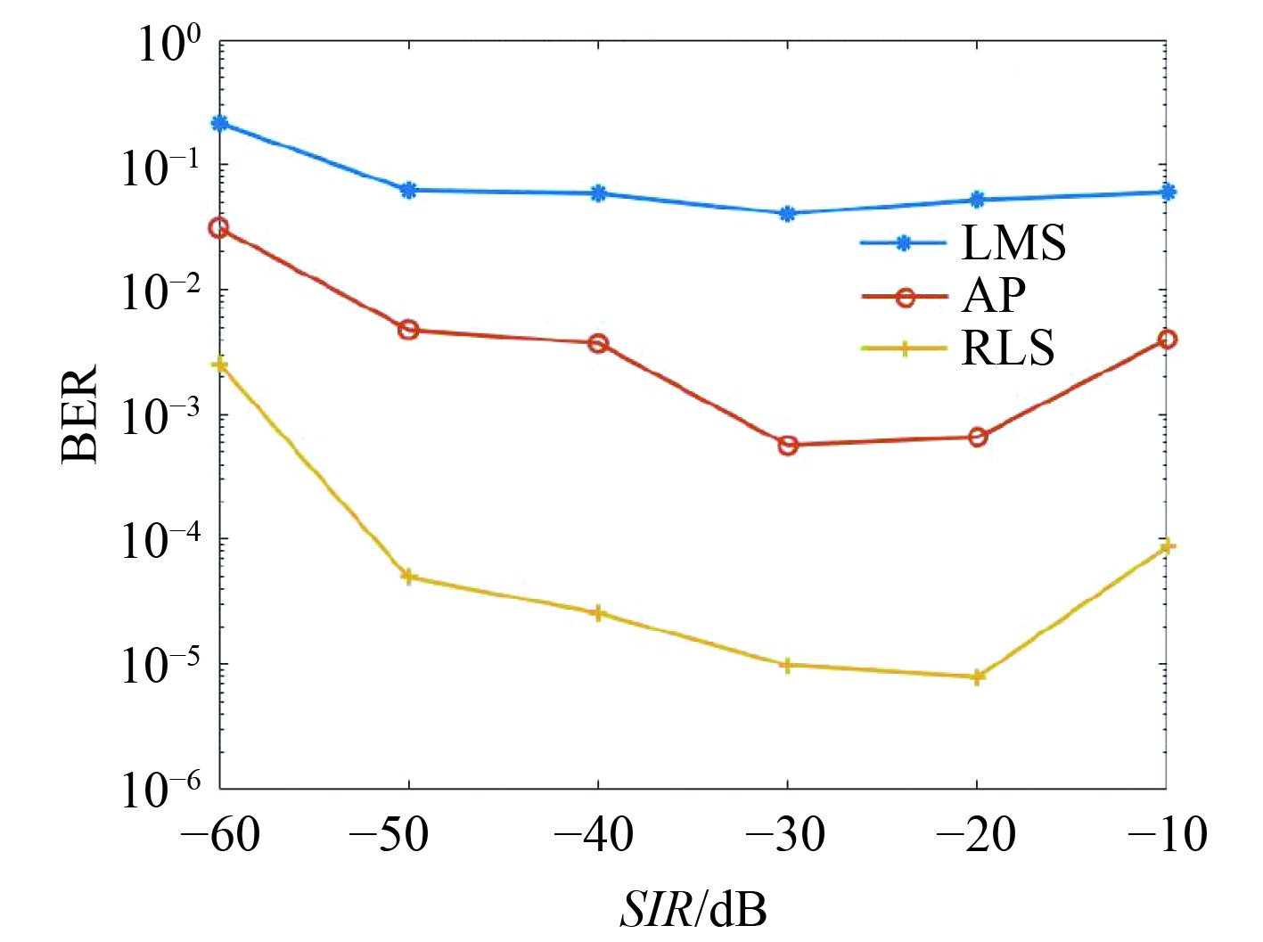 图 4 接收信号信干比不同时3种算法的误码率 Fig. 4 BER of three algorithms under different SINR of the received signal |