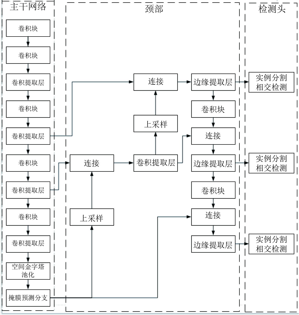 改进模型中,首先将YOLO v11模型骨干部分的空间金字塔加入掩膜预测功能,融合为一个分支,其次改进颈部的卷积层为边缘提取层,为避免极端情况下,船舶与泊位相撞后仍出现距离自识别的情况,对头部进行改造,加入多边形相交检测指令,即判断船舶和泊位是否相交,将两者最小距离距离直接设为0。此外,为了应对类别不平衡问题,本实验采用focal loss函数替代传统框架中的交叉熵损失,提高改进后的模型对于泊位、泊位线等难样本的学习能力,进一步增强了鲁棒性。改进后的YOLO v11-seg模型网络结构如图3所示。