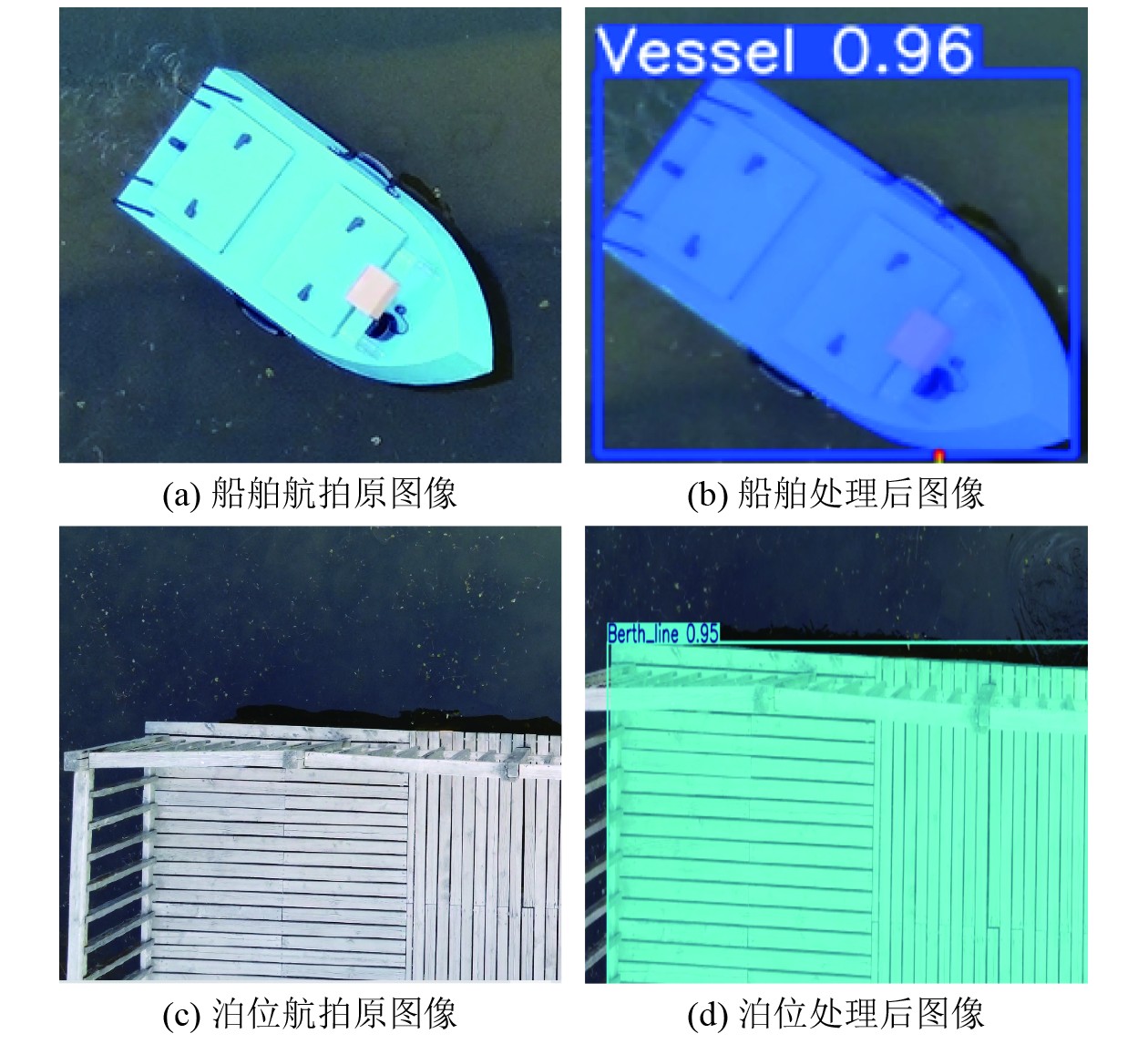 目前辅助靠泊数据的收集主要依靠岸基设备或船载仪器,声呐[2]和超声波传感器[3]被固定在岸端实现对船与岸的距离、靠泊航速等信息的实时传递。但利用岸基设备感知靠泊信息时,灵活性较差;而船端设备机动性好,能够更好地获取靠泊信息。如Mizuchi等[4]在多个视角建立可视化体系,辅助识别可用距离。甘兴旺等[5]将摄像机、雷达与船舶自动辨识技术相结合改善测距的准确性。张山甲等[6]利用相机对港区一块醒目的标记点进行辨识,并利用透视投影方法得到该标记点与船舶标记之间的距离。费鹏等[7]在无人船安装双目摄像机,通过算出影像的视差量确定位置。上述研究主要获取船舶与泊位间距离信息,然而大多仅限于数据,且获得步骤繁琐,欠缺实时性,无法将其融合并直观简便地传输给驾驶台[8]。常规的多摄像机图像融合技术,尽管可以获得船四周的场景,但是在装配时,其安装的方位和角度都是固定的,因此在调节视角方面存在局限性[9]。无人机不但能够监测船舶周边环境,而且可以对空中拍摄的视频进行处理,从而计算出船舶停靠的相关参数,并将其传送到驾驶台和岸端[10]。魏宁等[11]利用无人机航拍数据集构建船岸间动态信息模型,可准确、实时地识别船舶靠泊距离与角度数据。董瑞恒等[12]在此基础上将船舶和岸线转移到三维体中,利用最近距离求解算法探索船舶与泊位线之间的最近距离,进一步验证了无人机辅助靠泊的可行性。但是上述研究成果还未涉及船舶靠泊应用下图像识别算法的迭代、航拍数据集背景复杂情况下的目标分割优化与实时监测。随着计算机图像技术的发展,YOLO系列图像识别算法推出了在航拍领域更具鲁棒性的YOLO v11;而视网膜分割掩膜任务框架因其可以可多维方向性增强病理分割效果,在铁路、公路、航空、医学领域广泛使用。将两者融合提升无人机辅助靠泊的性能成为可能。
