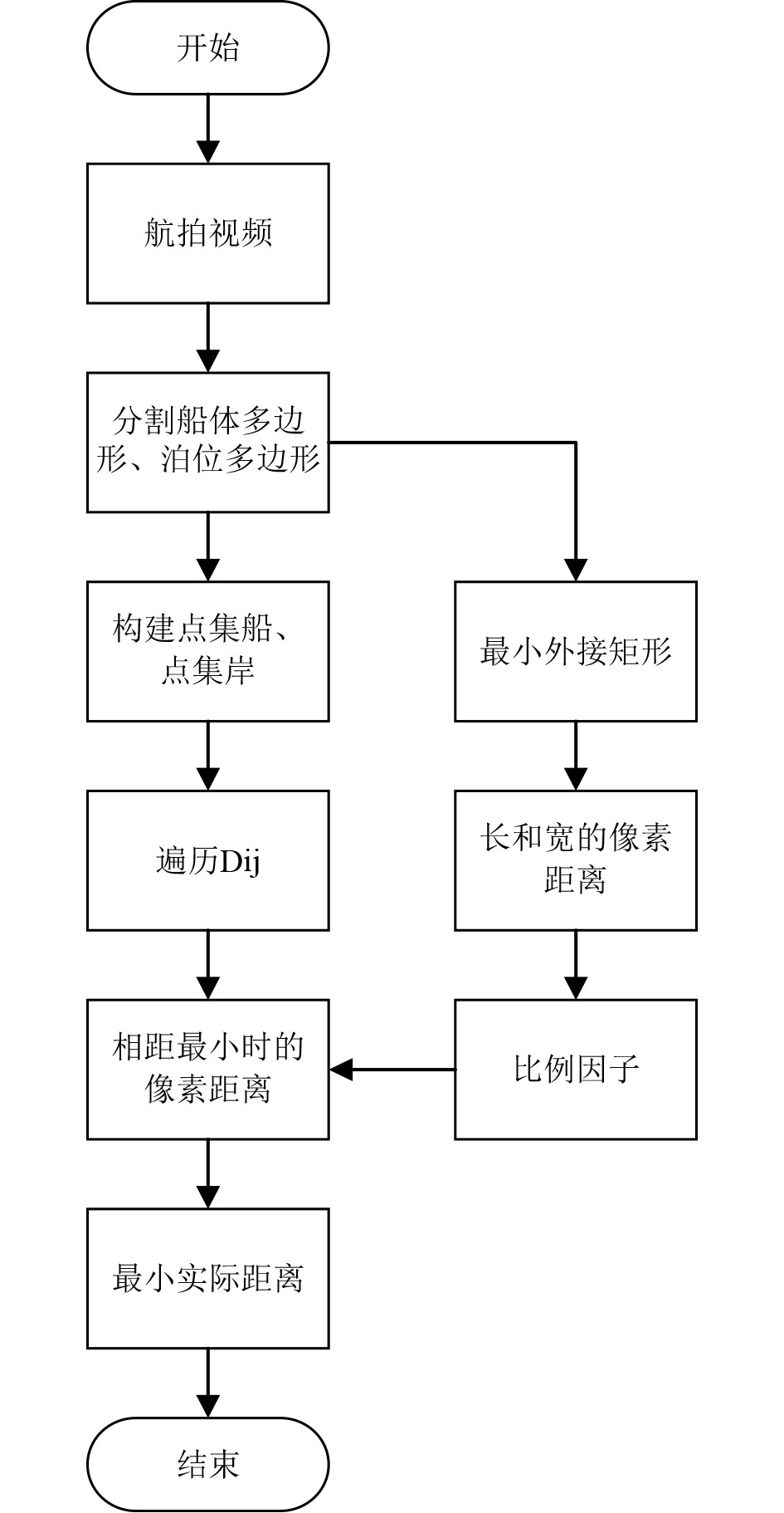 在实验中,船舶与无人机之间的距离一直实时变化,这导致船舶在无人机拍摄的视频图像中的像素尺寸不为定值。因此,首先实时测定船舶长和宽的像素数据,其次,将船舶真实的长和宽与该数据做比,得到实时的比例因子(米/像素),最后,用已测得的船舶与泊位线间最近的像素距离乘比例因子,即可完成实时动态距离匹配,得到最近的实际距离。