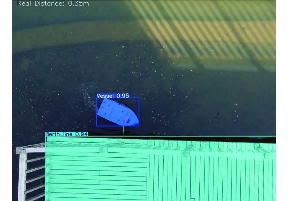 鉴于此,本文提出一种基于无人机视角的辅助靠泊距离实时测定办法。首先,采用无人机获取船舶停靠泊位的视频影像,并对其制作数据集。在YOLO v11-seg模型中加入视网膜分割掩膜任务框架,对船舶边界进行精细分割,得到高分辨率掩膜。其次,采用掩膜提取和几何分析相结合的方法,获取船舶和泊位面的多边形坐标,并在此基础上计算出两者的边界线。最后,利用点集距离矩阵法和动态距离匹配技术,转化实际距离。
