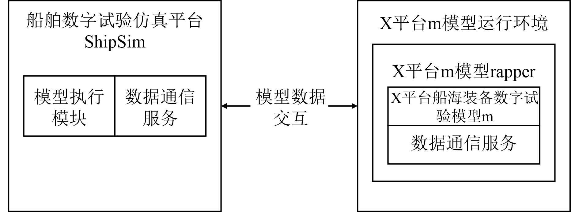 船舶验证仿真平台ShipSim与运行m模型的异构X平台,通过网络连通。ShipSim通过内置的数据通信服务模块,发送X平台m模型运行所需参数给X平台,X平台通过m模型的封装器rapper接收m模型执行参数,执行m模型,并将m模型执行结果通过rapper内置的数据通信服务发送给ShipSim平台,完成异构X平台m模型集成。