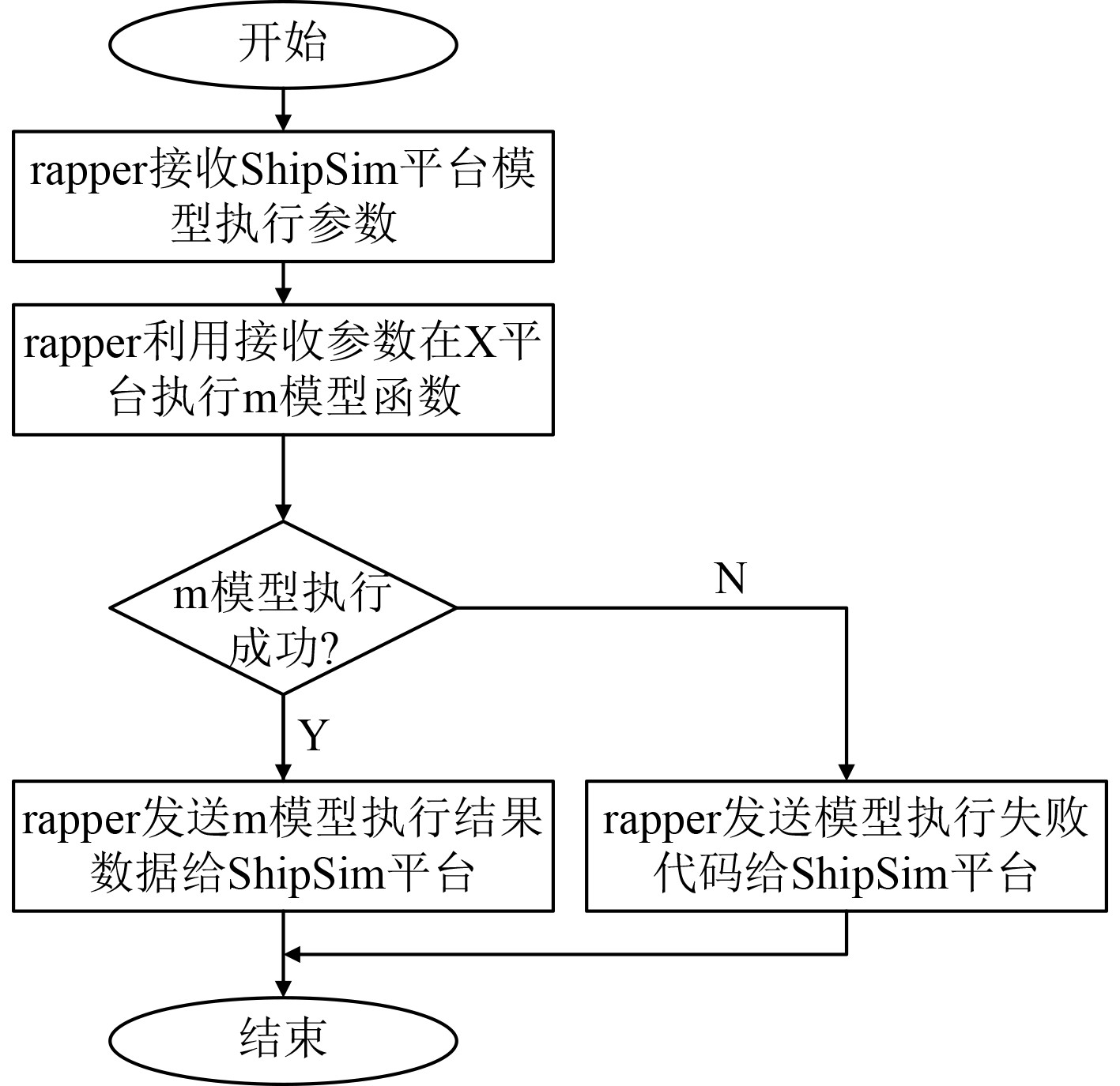 X平台m模型rapper的执行流程如图4所示。执行过程为:X平台m模型的rapper通过UDP服务接收到ShipSim平台发送的模型执行参数,rapper利用m模型参数在m模型的原始运行环境X平台下执行m模型,如果m模型执行失败则发送执行失败代码给ShipSim平台,如果m模型执行成功,则rapper获取m模型的执行结果数据并发送给ShipSim平台。
