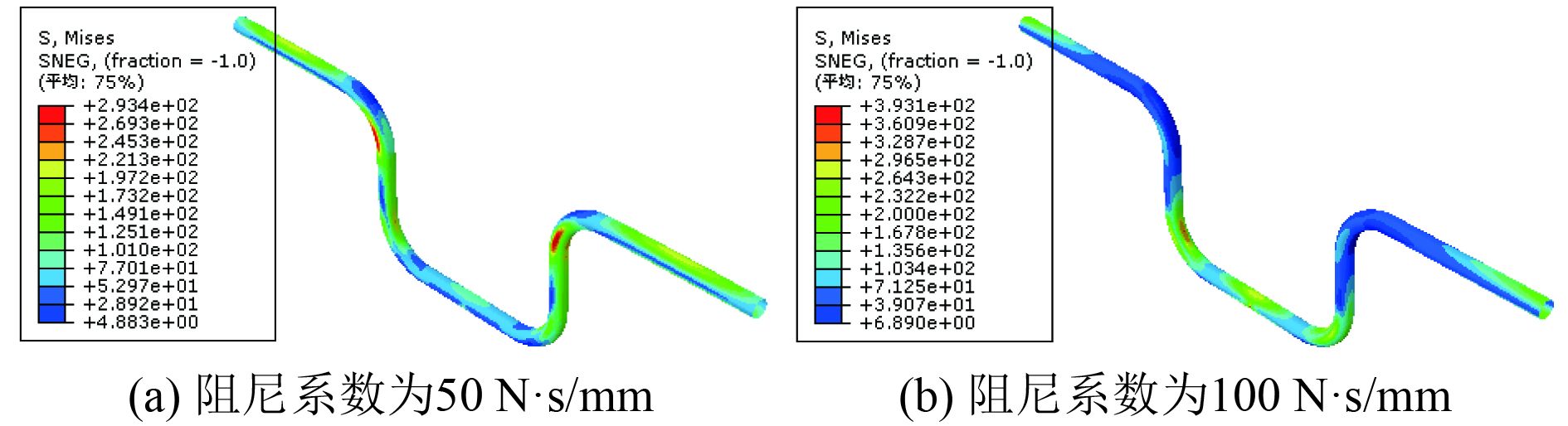 不同阻尼系数下,蒸汽管路最大综合应力分布如图10所示。可知,当阻尼系数为50 N·s·mm−1时整个蒸汽管路的应力分布比较均匀,没有出现应力集中的问题。而当阻尼系数为100 N·s/mm时,由于阻尼系数过大,在U形底部与弹簧吊架连接部位出现了局部较大的应力集中。因此,阻尼系数对提高蒸汽管路抗冲击性能存在一个最优值。