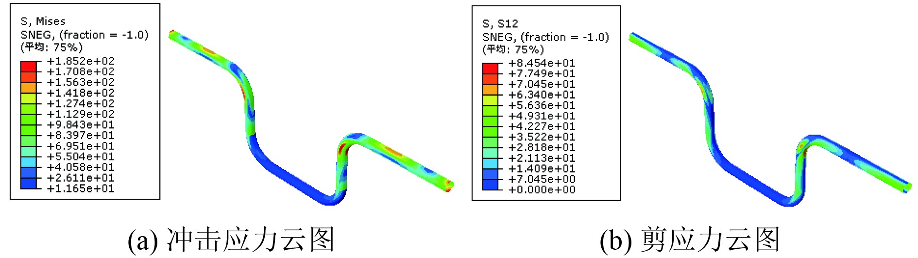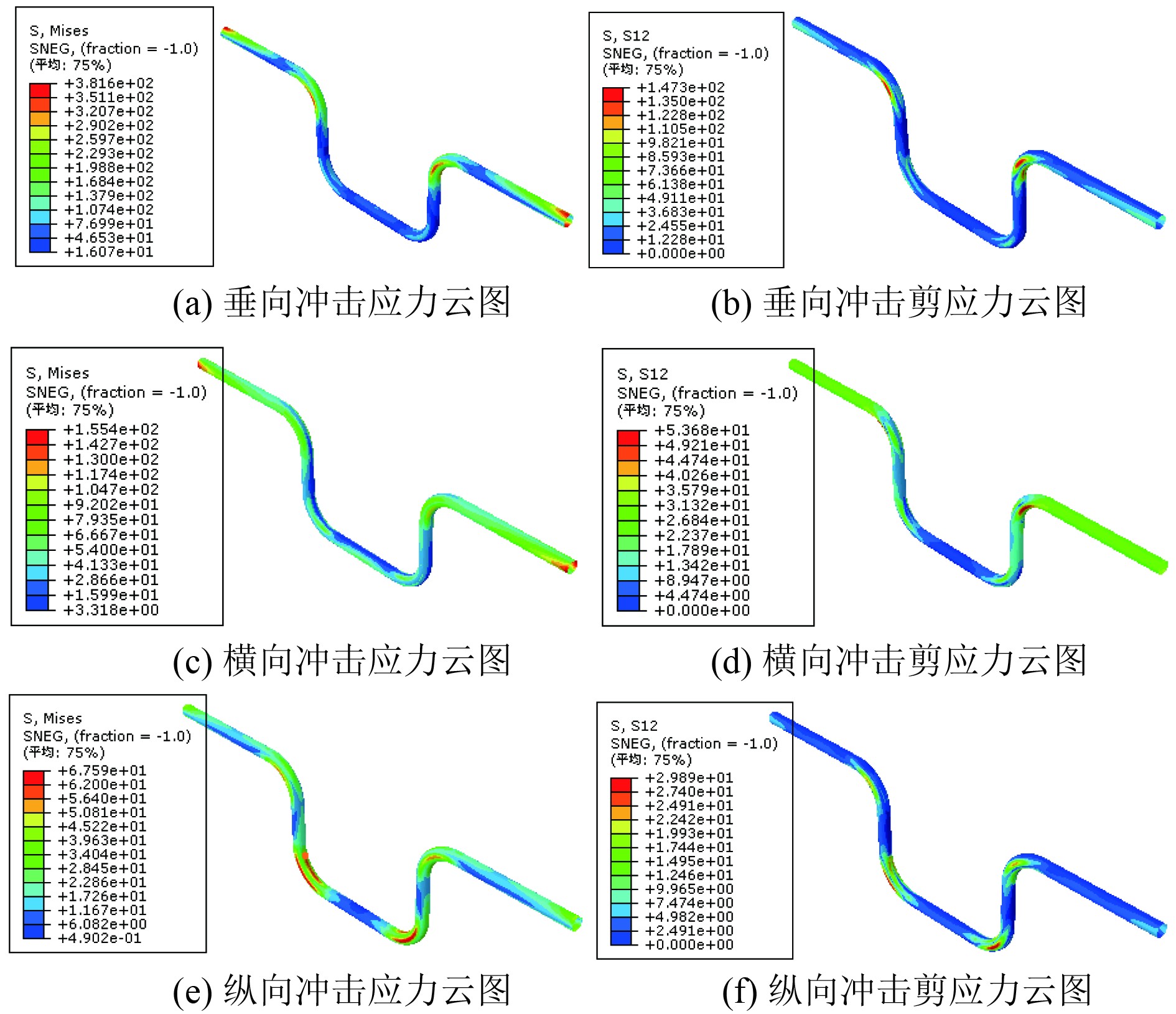 图 6 频域冲击作用下蒸汽管路冲击应力分布云图 Fig. 6 Contours of impact stress in stream pipeline under frequency-domain shock |