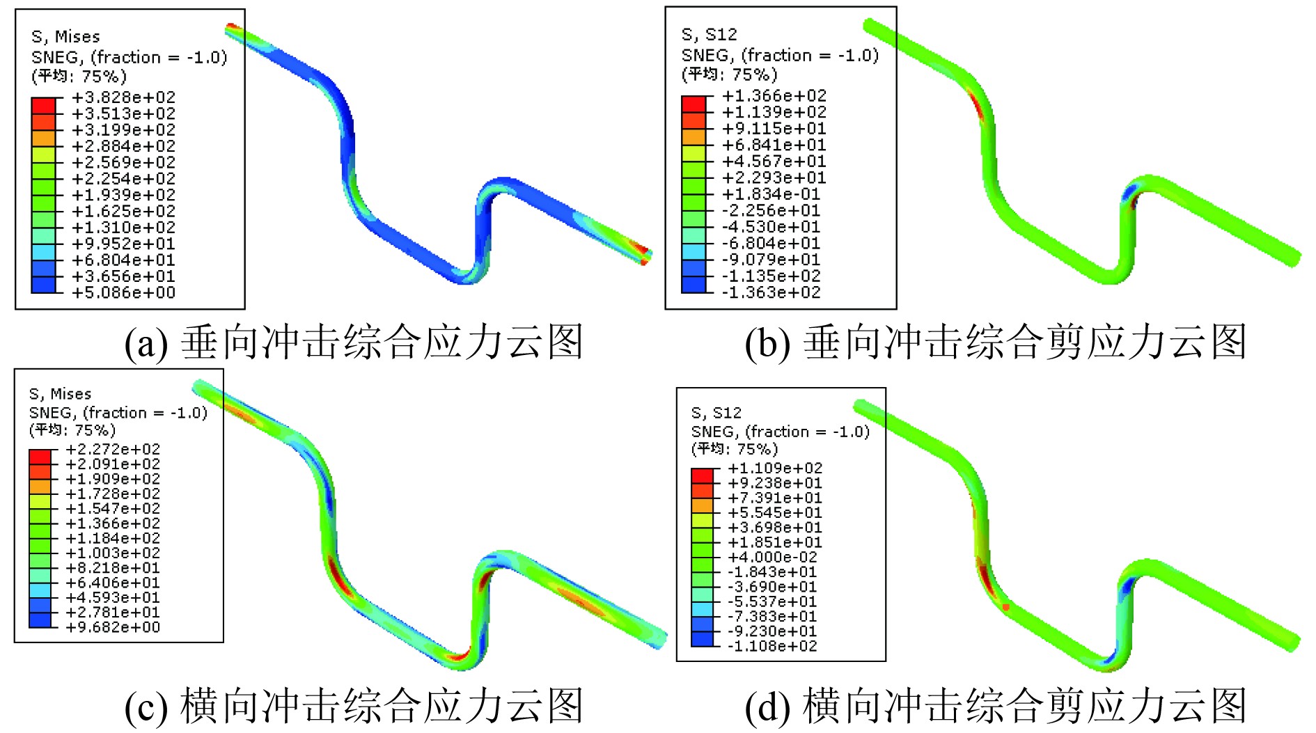 图 8 垂向冲击载荷作用下改进蒸汽管路冲击应力分布云图 Fig. 8 Contours of impact stress in improved stream pipeline under vertical frequency-domain shock |
