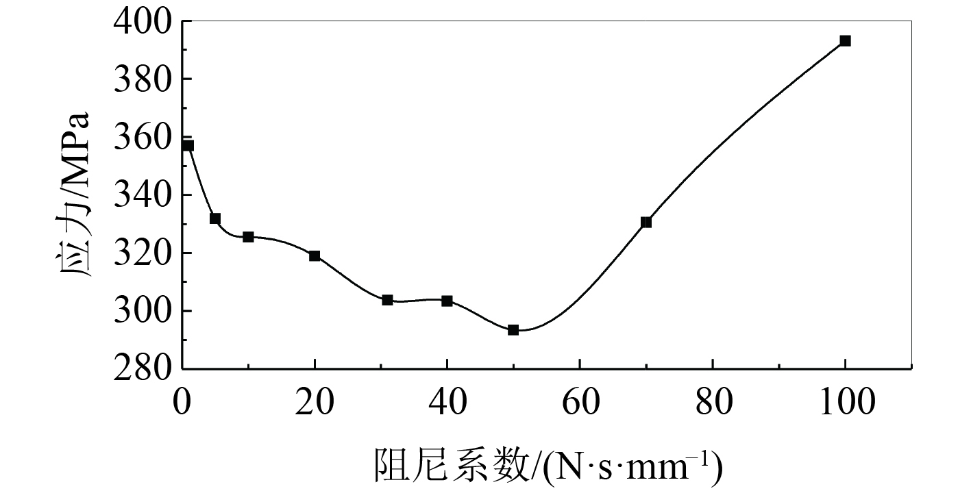 图 9 垂向冲击载荷作用下蒸汽管路最大综合应力值随阻尼系数变化曲线图 Fig. 9 Curve of maximum comprehensive stress with different damping coefficients under vertical time-domain shock |